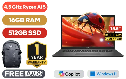 MSI Modern A15 AI+ F3HMG AMD Ryzen AI 5-330 up to 4.5GHz Processor, 12MB Cache, 4x Cores, 8x Threads / 16GB DDR5 RAM / 512GB Ultra-Fast NVMe SSD / 15.6" FHD (1920x1080) IPS-Level Display / Integrated AMD Radeon 820M Graphics / Windows 11 Home (64bit) / RZ616 WiFi 6E Wireless LAN / Bluetooth 5.3 / 720P HD IR Camera with Privacy Shutter / 2x USB Type-A / 2x USB Type-C (Supports DisplayPort / Power Delivery 3.0) / 1 x HDMI / 1x Headphone and Microphone Combo Jack / 1x RJ-45 / 1x MicroSD Card Reader / White Backlit Keyboard / 2x Integrated Speakers / 1 Year Warranty / MSI Modern A15 AI+ F3HMG Ryzen AI 5 Laptop DealsMSI Modern A15 AI+ F3HMG AMD Ryzen AI 5-330 up to 4.5GHz Processor, 12MB Cache, 4x Cores, 8x Threads / 16GB DDR5 RAM / 512GB Ultra-Fast NVMe SSD / 15.6" FHD (1920x1080) IPS-Level Display / Integrated AMD Radeon 820M Graphics / Windows 11 Home (64bit) / RZ616 WiFi 6E Wireless LAN / Bluetooth 5.3 / 720P HD IR Camera with Privacy Shutter / 2x USB Type-A / 2x USB Type-C (Supports DisplayPort / Power Delivery 3.0) / 1 x HDMI / 1x Headphone and Microphone Combo Jack / 1x RJ-45 / 1x MicroSD Card Reader / White Backlit Keyboard / 2x Integrated Speakers / 1 Year Warranty / MSI Modern A15 AI+ F3HMG Ryzen AI 5 Laptop Deals [MODERN A15 AI+ F3HMG-012ZA] / [+] GET FREE EVETECH FLUX Premium Gaming Backpack+ FREE DELIVERY !