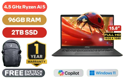 MSI Modern A15 AI+ F3HMG AMD Ryzen AI 5-330 up to 4.5GHz Processor, 12MB Cache, 4x Cores, 8x Threads / 96GB DDR5 RAM / 2TB Ultra-Fast NVMe SSD / 15.6" FHD (1920x1080) IPS-Level Display / Integrated AMD Radeon 820M Graphics / Windows 11 Home (64bit) / RZ616 WiFi 6E Wireless LAN / Bluetooth 5.3 / 720P HD IR Camera with Privacy Shutter / 2x USB Type-A / 2x USB Type-C (Supports DisplayPort / Power Delivery 3.0) / 1 x HDMI / 1x Headphone and Microphone Combo Jack / 1x RJ-45 / 1x MicroSD Card Reader / White Backlit Keyboard / 2x Integrated Speakers / 1 Year Warranty / MSI Modern A15 AI+ F3HMG Ryzen AI 5 Laptop DealsMSI Modern A15 AI+ F3HMG AMD Ryzen AI 5-330 up to 4.5GHz Processor, 12MB Cache, 4x Cores, 8x Threads / 96GB DDR5 RAM / 2TB Ultra-Fast NVMe SSD / 15.6" FHD (1920x1080) IPS-Level Display / Integrated AMD Radeon 820M Graphics / Windows 11 Home (64bit) / RZ616 WiFi 6E Wireless LAN / Bluetooth 5.3 / 720P HD IR Camera with Privacy Shutter / 2x USB Type-A / 2x USB Type-C (Supports DisplayPort / Power Delivery 3.0) / 1 x HDMI / 1x Headphone and Microphone Combo Jack / 1x RJ-45 / 1x MicroSD Card Reader / White Backlit Keyboard / 2x Integrated Speakers / 1 Year Warranty / MSI Modern A15 AI+ F3HMG Ryzen AI 5 Laptop Deals [MODERN A15 AI+ F3HMG-012ZA/96GB/2TB] / [+] GET FREE EVETECH FLUX Premium Gaming Backpack+ FREE DELIVERY !