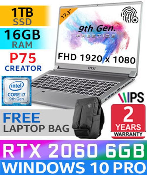 MSI P75 Creator 9SE 9th Gen Intel Core i7-9750H up to 4.5GHz Processor, 12MB Cache, 6x Cores, 12x Threads / 16GB DDR4 RAM / 1TB Ultra-Fast SSD / 17.3" Full HD 1920x1080 Anti-Glare IPS-Level Thin Bezel Display / NVIDIA 20 Series GeForce RTX 2060 6GB GDDR6 Graphics With Desktop Level Performance / <span style="font-size: 18px; color: red;">Windows 10 Professional</span> / 802.11 ac Wireless LAN / Steelseries White Backlight Keyboard Keyboard / HD Webcam (30fps@720p) / Bluetooth v5 / Fingerprint Reader / 1 x HDMI / 1 x Mini Displayport / 2 x USB Type-C / 3 x USB 3.2 Type-A / Exclusive Cooler Boost Trinity Cooling System / Nahimic 3 Audio Technology / Ultra-light 1.8 kg / Up to 8 Hours Battery Life / <span style="color:blue; font-size:18px;">2 Years Fetch And Repair MSI Warranty</span> / FREE MSI Gaming Backpack / MSI P75 Creator 9SE 8th Gen Core i7 RTX 2060 Pro Gaming LaptopMSI P75 Creator 9SE 9th Gen Intel Core i7-9750H up to 4.5GHz Processor, 12MB Cache, 6x Cores, 12x Threads / 16GB DDR4 RAM / 1TB Ultra-Fast SSD / 17.3" Full HD 1920x1080 Anti-Glare IPS-Level Thin Bezel Display / NVIDIA 20 Series GeForce RTX 2060 6GB GDDR6 Graphics With Desktop Level Performance / Windows 10 Professional / 802.11 ac Wireless LAN / Steelseries White Backlight Keyboard Keyboard / HD Webcam (30fps@720p) / Bluetooth v5 / Fingerprint Reader / 1 x HDMI / 1 x Mini Displayport / 2 x USB Type-C / 3 x USB 3.2 Type-A / Exclusive Cooler Boost Trinity Cooling System / Nahimic 3 Audio Technology / Ultra-light 1.8 kg / Up to 8 Hours Battery Life / 2 Years Fetch And Repair MSI Warranty / FREE MSI Gaming Backpack / MSI P75 Creator 9SE 8th Gen Core i7 RTX 2060 Pro Gaming Laptop [MSI-P75-9SE-467ZA] + FREE DELIVERY !