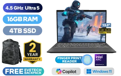 MSI Prestige 13 AI Evo A1MG Intel Core Ultra 5-125H Up to 4.5GHz Processor, 18MB Cache, 14x Cores, 18x Threads / 16GB LPDDR5X RAM / 4TB Ultra-Fast NVMe SSD / 13.3" 2.8K (2880x1800) OLED Display / Integrated Intel Arc Graphics / Windows 11 Home (64bit) / Intel Killer BE Wi-Fi 7 BE1750w Wireless LAN / Bluetooth 5.4 / FHD IR Web Camera / 1x Type-A / 2x USB Type-C (Thunderbolt 4 / DisplayPort / Power Delivery) / 1x HDMI / 1x Headphone & Microphone Combo Jack / 1x Micro SD Card Reader / Fingerprint Sensor / White Backlit Keyboard / MSI Prestige 13 AI Evo A1MG Core Ultra 5 Laptop DealMSI Prestige 13 AI Evo A1MG Intel Core Ultra 5-125H Up to 4.5GHz Processor, 18MB Cache, 14x Cores, 18x Threads / 16GB LPDDR5X RAM / 4TB Ultra-Fast NVMe SSD / 13.3" 2.8K (2880x1800) OLED Display / Integrated Intel Arc Graphics / Windows 11 Home (64bit) / Intel Killer BE Wi-Fi 7 BE1750w Wireless LAN / Bluetooth 5.4 / FHD IR Web Camera / 1x Type-A / 2x USB Type-C (Thunderbolt 4 / DisplayPort / Power Delivery) / 1x HDMI / 1x Headphone & Microphone Combo Jack / 1x Micro SD Card Reader / Fingerprint Sensor / White Backlit Keyboard / MSI Prestige 13 AI Evo A1MG Core Ultra 5 Laptop Deal [Prestige-13 AI+ Evo-A1MG-276ZA/4TB] / [+] GET FREE EVETECH DASH Premium Gaming Backpack+ FREE DELIVERY !