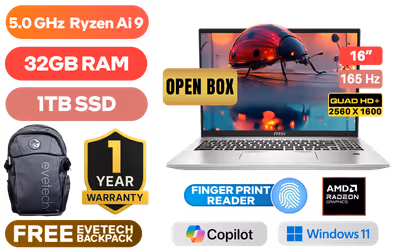 [OPEN BOX] MSI Prestige A16 AI + A3HMG AMD Ryzen AI 9 365 up to 5.0GHz Processor, 34MB Cache, 10x Cores, 20x Threads / 32GB LPDDR5X RAM / 1TB Ultra-Fast NVMe SSD / 16" QHD+ (2560x1600) 165Hz Anti-glare IPS-Level Display / AMD Radeon 880M Integrated Graphics / Windows 11 Home (64bit) / Qualcomm FastConnect 7800 Wi-Fi 7 Wireless LAN / Bluetooth 5.4 / White Backlit Keyboard / 1080p FHD IR Web Camera / Fingerprint Reader / 1 x HDMI 2.1 / 1x USB 3.2 Type-A / 2x USB Type-C (USB4® / DisplayPort™/ Power Delivery 3.0/ Thunderbolt™ 4 compatible) / 1x Headphone-out & Audio-in Combo Jack / 1x Micro SD Card Reader / 1 Year Warranty / MSI Prestige A16 AI+ Ryzen AI 9 Laptop[OPEN BOX] MSI Prestige A16 AI + A3HMG AMD Ryzen AI 9 365 up to 5.0GHz Processor, 34MB Cache, 10x Cores, 20x Threads / 32GB LPDDR5X RAM / 1TB Ultra-Fast NVMe SSD / 16" QHD+ (2560x1600) 165Hz Anti-glare IPS-Level Display / AMD Radeon 880M Integrated Graphics / Windows 11 Home (64bit) / Qualcomm FastConnect 7800 Wi-Fi 7 Wireless LAN / Bluetooth 5.4 / White Backlit Keyboard / 1080p FHD IR Web Camera / Fingerprint Reader / 1 x HDMI 2.1 / 1x USB 3.2 Type-A / 2x USB Type-C (USB4® / DisplayPort™/ Power Delivery 3.0/ Thunderbolt™ 4 compatible) / 1x Headphone-out & Audio-in Combo Jack / 1x Micro SD Card Reader / 1 Year Warranty / MSI Prestige A16 AI+ Ryzen AI 9 Laptop [OB-PRESTIGE-A16-AI-A3HMG-078ZA/1TB] / [+] GET FREE EVETECH FLUX Premium Gaming Backpack+ FREE DELIVERY !