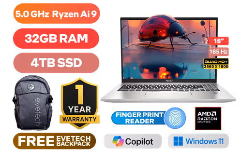 MSI Prestige A16 AI + A3HMG AMD Ryzen AI 9 365 up to 5.0GHz Processor, 34MB Cache, 10x Cores, 20x Threads / 32GB LPDDR5X RAM / 4TB Ultra-Fast NVMe SSD / 16" QHD+ (2560x1600) 165Hz Anti-glare IPS-Level Display / AMD Radeon 880M Integrated Graphics / Windows 11 Home (64bit) / Qualcomm FastConnect 7800 Wi-Fi 7 Wireless LAN / Bluetooth 5.4 / White Backlit Keyboard / 1080p FHD IR Web Camera / Fingerprint Reader / 1 x HDMI 2.1 / 1x USB 3.2 Type-A / 2x USB Type-C (USB4® / DisplayPort™/ Power Delivery 3.0/ Thunderbolt™ 4 compatible) / 1x Headphone-out & Audio-in Combo Jack / 1x Micro SD Card Reader / 1 Year Warranty / MSI Prestige A16 AI+ Ryzen AI 9 LaptopMSI Prestige A16 AI + A3HMG AMD Ryzen AI 9 365 up to 5.0GHz Processor, 34MB Cache, 10x Cores, 20x Threads / 32GB LPDDR5X RAM / 4TB Ultra-Fast NVMe SSD / 16" QHD+ (2560x1600) 165Hz Anti-glare IPS-Level Display / AMD Radeon 880M Integrated Graphics / Windows 11 Home (64bit) / Qualcomm FastConnect 7800 Wi-Fi 7 Wireless LAN / Bluetooth 5.4 / White Backlit Keyboard / 1080p FHD IR Web Camera / Fingerprint Reader / 1 x HDMI 2.1 / 1x USB 3.2 Type-A / 2x USB Type-C (USB4® / DisplayPort™/ Power Delivery 3.0/ Thunderbolt™ 4 compatible) / 1x Headphone-out & Audio-in Combo Jack / 1x Micro SD Card Reader / 1 Year Warranty / MSI Prestige A16 AI+ Ryzen AI 9 Laptop [PRESTIGE-A16-AI-A3HMG-078ZA/4TB] / [+] GET FREE EVETECH FLUX Premium Gaming Backpack+ FREE DELIVERY !