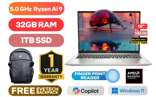 MSI Prestige A16 AI + A3HMG AMD Ryzen AI 9 365 up to 5.0GHz Processor, 34MB Cache, 10x Cores, 20x Threads / 32GB LPDDR5X RAM / 1TB Ultra-Fast NVMe SSD / 16" QHD+ (2560x1600) 165Hz Anti-glare IPS-Level Display / AMD Radeon 880M Integrated Graphics / Windows 11 Home (64bit) / Qualcomm FastConnect 7800 Wi-Fi 7 Wireless LAN / Bluetooth 5.4 / White Backlit Keyboard / 1080p FHD IR Web Camera / Fingerprint Reader / 1 x HDMI 2.1 / 1x USB 3.2 Type-A / 2x USB Type-C (USB4® / DisplayPort™/ Power Delivery 3.0/ Thunderbolt™ 4 compatible) / 1x Headphone-out & Audio-in Combo Jack / 1x Micro SD Card Reader / 1 Year Warranty / MSI Prestige A16 AI+ Ryzen AI 9 LaptopMSI Prestige A16 AI + A3HMG AMD Ryzen AI 9 365 up to 5.0GHz Processor, 34MB Cache, 10x Cores, 20x Threads / 32GB LPDDR5X RAM / 1TB Ultra-Fast NVMe SSD / 16" QHD+ (2560x1600) 165Hz Anti-glare IPS-Level Display / AMD Radeon 880M Integrated Graphics / Windows 11 Home (64bit) / Qualcomm FastConnect 7800 Wi-Fi 7 Wireless LAN / Bluetooth 5.4 / White Backlit Keyboard / 1080p FHD IR Web Camera / Fingerprint Reader / 1 x HDMI 2.1 / 1x USB 3.2 Type-A / 2x USB Type-C (USB4® / DisplayPort™/ Power Delivery 3.0/ Thunderbolt™ 4 compatible) / 1x Headphone-out & Audio-in Combo Jack / 1x Micro SD Card Reader / 1 Year Warranty / MSI Prestige A16 AI+ Ryzen AI 9 Laptop [PRESTIGE-A16-AI-A3HMG-078ZA/1TB] / [+] GET FREE EVETECH FLUX Premium Gaming Backpack+ FREE DELIVERY !