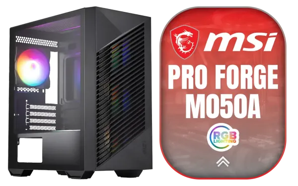 MSI Pro Forge M050A Mini Tower Gaming Case / Supports Motherboards Up to Micro-ATX / Auto Rainbow RGB Fan Lighting / Four Pre-Installed Cooling Fans / Top And Bottom Dust Filters / 3mm Tempered Glass Side Panel / 306-7G12N02-HH9