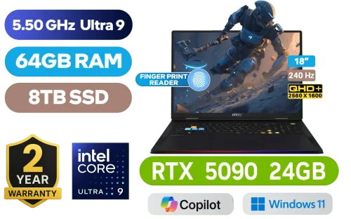 MSI Raider 18 HX AI A2XWJG-895ZA Intel® Core Ultra 9-285HX up to 5.50GHz Processor, 76MB Cache, 24x Cores, 24x Threads / 64GB DDR5 RAM / 8TB Ultra-Fast NVMe SSD / 18" QHD+ (2560x1600) 240Hz Anti-Glare IPS-Level Display / NVIDIA 50 Series GeForce RTX 5090 24GB GDDR7 Graphics Card / Windows 11 Home (64bit) / Intel Killer Wi-Fi 7 BE1750x Wireless LAN / Bluetooth 5.4 / 1080p FHD IR Camera with Privacy Shutter / 3x USB Type-A / 2 x USB Type-C (Supports Thunderbolt 5 / DisplayPort / Power Delivery 3.1) / 1 x HDMI / 1 x Headphone and Microphone Combo Jack / 1x RJ45 / 1x SD Card Reader / Fingerprint Reader / SteelSeries RGB Backlit Keyboard / 4x 2W Speaker and 2x 2W Woofer Audio System / 2 Year MSI Warranty / MSI Raider 18 HX AI A2XWJG Core Ultra 9 RTX 5090 Gaming LaptopMSI Raider 18 HX AI A2XWJG-895ZA Intel® Core Ultra 9-285HX up to 5.50GHz Processor, 76MB Cache, 24x Cores, 24x Threads / 64GB DDR5 RAM / 8TB Ultra-Fast NVMe SSD / 18" QHD+ (2560x1600) 240Hz Anti-Glare IPS-Level Display / NVIDIA 50 Series GeForce RTX 5090 24GB GDDR7 Graphics Card / Windows 11 Home (64bit) / Intel Killer Wi-Fi 7 BE1750x Wireless LAN / Bluetooth 5.4 / 1080p FHD IR Camera with Privacy Shutter / 3x USB Type-A / 2 x USB Type-C (Supports Thunderbolt 5 / DisplayPort / Power Delivery 3.1) / 1 x HDMI / 1 x Headphone and Microphone Combo Jack / 1x RJ45 / 1x SD Card Reader / Fingerprint Reader / SteelSeries RGB Backlit Keyboard / 4x 2W Speaker and 2x 2W Woofer Audio System / 2 Year MSI Warranty / MSI Raider 18 HX AI A2XWJG Core Ultra 9 RTX 5090 Gaming Laptop [Raider-18-HX-AI-A2XWJG-895ZA/64GB/8TB] / [+]Get Resident Evil: Requiem with select GeForce RTX 50 Series (Standard Edition)+ FREE DELIVERY !
