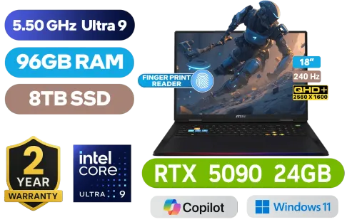 MSI Raider 18 HX AI A2XWJG-895ZA Intel® Core Ultra 9-285HX up to 5.50GHz Processor, 76MB Cache, 24x Cores, 24x Threads / 96GB DDR5 RAM / 8TB Ultra-Fast NVMe SSD / 18" QHD+ (2560x1600) 240Hz Anti-Glare IPS-Level Display / NVIDIA 50 Series GeForce RTX 5090 24GB GDDR7 Graphics Card / Windows 11 Home (64bit) / Intel Killer Wi-Fi 7 BE1750x Wireless LAN / Bluetooth 5.4 / 1080p FHD IR Camera with Privacy Shutter / 3x USB Type-A / 2 x USB Type-C (Supports Thunderbolt 5 / DisplayPort / Power Delivery 3.1) / 1 x HDMI / 1 x Headphone and Microphone Combo Jack / 1x RJ45 / 1x SD Card Reader / Fingerprint Reader / SteelSeries RGB Backlit Keyboard / 4x 2W Speaker and 2x 2W Woofer Audio System / 2 Year MSI Warranty / MSI Raider 18 HX AI A2XWJG Core Ultra 9 RTX 5090 Gaming LaptopMSI Raider 18 HX AI A2XWJG-895ZA Intel® Core Ultra 9-285HX up to 5.50GHz Processor, 76MB Cache, 24x Cores, 24x Threads / 96GB DDR5 RAM / 8TB Ultra-Fast NVMe SSD / 18" QHD+ (2560x1600) 240Hz Anti-Glare IPS-Level Display / NVIDIA 50 Series GeForce RTX 5090 24GB GDDR7 Graphics Card / Windows 11 Home (64bit) / Intel Killer Wi-Fi 7 BE1750x Wireless LAN / Bluetooth 5.4 / 1080p FHD IR Camera with Privacy Shutter / 3x USB Type-A / 2 x USB Type-C (Supports Thunderbolt 5 / DisplayPort / Power Delivery 3.1) / 1 x HDMI / 1 x Headphone and Microphone Combo Jack / 1x RJ45 / 1x SD Card Reader / Fingerprint Reader / SteelSeries RGB Backlit Keyboard / 4x 2W Speaker and 2x 2W Woofer Audio System / 2 Year MSI Warranty / MSI Raider 18 HX AI A2XWJG Core Ultra 9 RTX 5090 Gaming Laptop [Raider-18-HX-AI-A2XWJG-895ZA/96GB/8TB] / [+]Get Resident Evil: Requiem with select GeForce RTX 50 Series (Standard Edition)+ FREE DELIVERY !