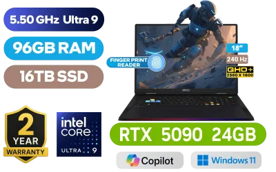 MSI Raider 18 HX AI A2XWJG-264ZA Intel® Core Ultra 9-285HX up to 5.50GHz Processor, 76MB Cache, 24x Cores, 24x Threads / 96GB DDR5 RAM / 16TB Ultra-Fast NVMe SSD / 18" QHD+ (2560x1600) 240Hz Anti-Glare IPS-Level Display / NVIDIA 50 Series GeForce RTX 5090 24GB GDDR7 Graphics Card / Windows 11 Home (64bit) / Intel Killer Wi-Fi 7 BE1750x Wireless LAN / Bluetooth 5.4 / 1080p FHD IR Camera with Privacy Shutter / 3x USB Type-A / 2 x USB Type-C (Supports Thunderbolt 5 / DisplayPort / Power Delivery 3.1) / 1 x HDMI / 1 x Headphone and Microphone Combo Jack / 1x RJ45 / 1x SD Card Reader / Fingerprint Reader / SteelSeries RGB Backlit Keyboard / 4x 2W Speaker and 2x 2W Woofer Audio System / 2 Year MSI Warranty / MSI Raider 18 HX AI A2XWJG Core Ultra 9 RTX 5090 Gaming LaptopMSI Raider 18 HX AI A2XWJG-264ZA Intel® Core Ultra 9-285HX up to 5.50GHz Processor, 76MB Cache, 24x Cores, 24x Threads / 96GB DDR5 RAM / 16TB Ultra-Fast NVMe SSD / 18" QHD+ (2560x1600) 240Hz Anti-Glare IPS-Level Display / NVIDIA 50 Series GeForce RTX 5090 24GB GDDR7 Graphics Card / Windows 11 Home (64bit) / Intel Killer Wi-Fi 7 BE1750x Wireless LAN / Bluetooth 5.4 / 1080p FHD IR Camera with Privacy Shutter / 3x USB Type-A / 2 x USB Type-C (Supports Thunderbolt 5 / DisplayPort / Power Delivery 3.1) / 1 x HDMI / 1 x Headphone and Microphone Combo Jack / 1x RJ45 / 1x SD Card Reader / Fingerprint Reader / SteelSeries RGB Backlit Keyboard / 4x 2W Speaker and 2x 2W Woofer Audio System / 2 Year MSI Warranty / MSI Raider 18 HX AI A2XWJG Core Ultra 9 RTX 5090 Gaming Laptop [Raider-18-HX-AI-A2XWJG-895ZA/96GB/16TB] / [+]Get Resident Evil Requiem with select GeForce RTX 50 Series (Standard Edition)+ FREE DELIVERY !