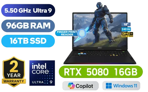 MSI Raider 18 HX AI A2XWIG Intel® Core® Ultra 9-285HX up to 5.50GHz Processor, 76MB Cache, 24x Cores, 24x Threads / 96GB DDR5 RAM / 16TB Ultra-Fast NVMe SSD / 18" QHD+ (2560x1600) Anti-Glare 240Hz, Anti-Glare, IPS-Level Display / NVIDIA 50 Series GeForce RTX 5080 16GB GDDR7 Graphics Card/ Windows 11 Home (64bit) / Killer Wi-Fi 7 BE1750x Wireless LAN / Bluetooth 5.4 / 1080P FHD IR Camera With Privacy Shutter / 3 x USB Type-A / 2 x USB Type-C (Supports Thunderbolt 5 / DisplayPort / Power Delivery 3.1) / 1 x HDMI / 1 x Headphone and Microphone Combo Jack / 1x SD Card Reader / Fingerprint Reader / RGB Backlit Keyboard / 4x 2W Speakers / 2 Year MSI Warranty / MSI Raider 18 HX AI A2XWIG Core Ultra 9 RTX 5080 Gaming LaptopMSI Raider 18 HX AI A2XWIG Intel® Core® Ultra 9-285HX up to 5.50GHz Processor, 76MB Cache, 24x Cores, 24x Threads / 96GB DDR5 RAM / 16TB Ultra-Fast NVMe SSD / 18" QHD+ (2560x1600) Anti-Glare 240Hz, Anti-Glare, IPS-Level Display / NVIDIA 50 Series GeForce RTX 5080 16GB GDDR7 Graphics Card/ Windows 11 Home (64bit) / Killer Wi-Fi 7 BE1750x Wireless LAN / Bluetooth 5.4 / 1080P FHD IR Camera With Privacy Shutter / 3 x USB Type-A / 2 x USB Type-C (Supports Thunderbolt 5 / DisplayPort / Power Delivery 3.1) / 1 x HDMI / 1 x Headphone and Microphone Combo Jack / 1x SD Card Reader / Fingerprint Reader / RGB Backlit Keyboard / 4x 2W Speakers / 2 Year MSI Warranty / MSI Raider 18 HX AI A2XWIG Core Ultra 9 RTX 5080 Gaming Laptop [Raider-18-HX-AI-A2XWIG-894ZA/96GB/16TB] / [+]Get Resident Evil: Requiem with select GeForce RTX 50 Series (Standard Edition)+ FREE DELIVERY !