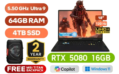 MSI Raider 18 HX AI A2XWIG-265ZA Intel® Core® Ultra 9-285HX up to 5.50GHz Processor, 76MB Cache, 24x Cores, 24x Threads / 64GB DDR5 RAM / 4TB Ultra-Fast NVMe SSD / 18" UHD+ (3840x2400) Anti-Glare 120Hz IPS-Level Display / NVIDIA 50 Series GeForce RTX 5080 16GB GDDR7 Graphics With Desktop Level Performance / Windows 11 Home (64bit) / Killer Wi-Fi 7 BE1750x Wireless LAN / Bluetooth 5.4 / Fingerprint Reader / 1080P FHD IR Camera With Privacy Shutter / 3 x USB Type-A / 2 x USB Type-C / 1 x HDMI / 1 x Headphone and Microphone Combo Jack / 1 x RJ-45 Ethernet Lan / 1x Express SD Card Reader / Surround Sound System by Dynaudio / Steelseries Per Key RGB Backlit Gaming Keyboard / FREE MSI Titan Gaming Backpack / 2 Year MSI Warranty / MSI Raider 18 HX AI A2XWIG-265ZA Intel Core Ultra 9 RTX 5080 Gaming LaptopMSI Raider 18 HX AI A2XWIG-265ZA Intel® Core® Ultra 9-285HX up to 5.50GHz Processor, 76MB Cache, 24x Cores, 24x Threads / 64GB DDR5 RAM / 4TB Ultra-Fast NVMe SSD / 18" UHD+ (3840x2400) Anti-Glare 120Hz IPS-Level Display / NVIDIA 50 Series GeForce RTX 5080 16GB GDDR7 Graphics With Desktop Level Performance / Windows 11 Home (64bit) / Killer Wi-Fi 7 BE1750x Wireless LAN / Bluetooth 5.4 / Fingerprint Reader / 1080P FHD IR Camera With Privacy Shutter / 3 x USB Type-A / 2 x USB Type-C / 1 x HDMI / 1 x Headphone and Microphone Combo Jack / 1 x RJ-45 Ethernet Lan / 1x Express SD Card Reader / Surround Sound System by Dynaudio / Steelseries Per Key RGB Backlit Gaming Keyboard / FREE MSI Titan Gaming Backpack / 2 Year MSI Warranty / MSI Raider 18 HX AI A2XWIG-265ZA Intel Core Ultra 9 RTX 5080 Gaming Laptop [RAIDER-18-HX-AI-A2XWIG-265ZA/4TB] / [+]Get Resident Evil Requiem with select GeForce RTX 50 Series (Standard Edition)+ FREE DELIVERY !