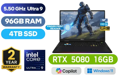 MSI Raider 18 HX AI A2XWIG Intel® Core® Ultra 9-285HX up to 5.50GHz Processor, 76MB Cache, 24x Cores, 24x Threads / 96GB DDR5 RAM / 4TB Ultra-Fast NVMe SSD / 18" QHD+ (2560x1600) Anti-Glare 240Hz, Anti-Glare, IPS-Level Display / NVIDIA 50 Series GeForce RTX 5080 16GB GDDR7 Graphics Card/ Windows 11 Home (64bit) / Killer Wi-Fi 7 BE1750x Wireless LAN / Bluetooth 5.4 / 1080P FHD IR Camera With Privacy Shutter / 3 x USB Type-A / 2 x USB Type-C (Supports Thunderbolt 5 / DisplayPort / Power Delivery 3.1) / 1 x HDMI / 1 x Headphone and Microphone Combo Jack / 1x SD Card Reader / Fingerprint Reader / RGB Backlit Keyboard / 4x 2W Speakers / 2 Year MSI Warranty / MSI Raider 18 HX AI A2XWIG Core Ultra 9 RTX 5080 Gaming LaptopMSI Raider 18 HX AI A2XWIG Intel® Core® Ultra 9-285HX up to 5.50GHz Processor, 76MB Cache, 24x Cores, 24x Threads / 96GB DDR5 RAM / 4TB Ultra-Fast NVMe SSD / 18" QHD+ (2560x1600) Anti-Glare 240Hz, Anti-Glare, IPS-Level Display / NVIDIA 50 Series GeForce RTX 5080 16GB GDDR7 Graphics Card/ Windows 11 Home (64bit) / Killer Wi-Fi 7 BE1750x Wireless LAN / Bluetooth 5.4 / 1080P FHD IR Camera With Privacy Shutter / 3 x USB Type-A / 2 x USB Type-C (Supports Thunderbolt 5 / DisplayPort / Power Delivery 3.1) / 1 x HDMI / 1 x Headphone and Microphone Combo Jack / 1x SD Card Reader / Fingerprint Reader / RGB Backlit Keyboard / 4x 2W Speakers / 2 Year MSI Warranty / MSI Raider 18 HX AI A2XWIG Core Ultra 9 RTX 5080 Gaming Laptop [Raider-18-HX-AI-A2XWIG-894ZA/96GB/4TB] / [+]Get Resident Evil: Requiem with select GeForce RTX 50 Series (Standard Edition)+ FREE DELIVERY !