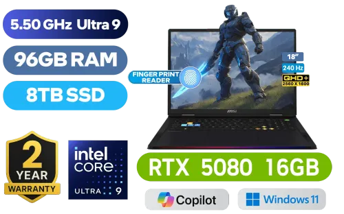 MSI Raider 18 HX AI A2XWIG Intel® Core® Ultra 9-285HX up to 5.50GHz Processor, 76MB Cache, 24x Cores, 24x Threads / 96GB DDR5 RAM / 8TB Ultra-Fast NVMe SSD / 18" QHD+ (2560x1600) Anti-Glare 240Hz, Anti-Glare, IPS-Level Display / NVIDIA 50 Series GeForce RTX 5080 16GB GDDR7 Graphics Card/ Windows 11 Home (64bit) / Killer Wi-Fi 7 BE1750x Wireless LAN / Bluetooth 5.4 / 1080P FHD IR Camera With Privacy Shutter / 3 x USB Type-A / 2 x USB Type-C (Supports Thunderbolt 5 / DisplayPort / Power Delivery 3.1) / 1 x HDMI / 1 x Headphone and Microphone Combo Jack / 1x SD Card Reader / Fingerprint Reader / RGB Backlit Keyboard / 4x 2W Speakers / 2 Year MSI Warranty / MSI Raider 18 HX AI A2XWIG Core Ultra 9 RTX 5080 Gaming LaptopMSI Raider 18 HX AI A2XWIG Intel® Core® Ultra 9-285HX up to 5.50GHz Processor, 76MB Cache, 24x Cores, 24x Threads / 96GB DDR5 RAM / 8TB Ultra-Fast NVMe SSD / 18" QHD+ (2560x1600) Anti-Glare 240Hz, Anti-Glare, IPS-Level Display / NVIDIA 50 Series GeForce RTX 5080 16GB GDDR7 Graphics Card/ Windows 11 Home (64bit) / Killer Wi-Fi 7 BE1750x Wireless LAN / Bluetooth 5.4 / 1080P FHD IR Camera With Privacy Shutter / 3 x USB Type-A / 2 x USB Type-C (Supports Thunderbolt 5 / DisplayPort / Power Delivery 3.1) / 1 x HDMI / 1 x Headphone and Microphone Combo Jack / 1x SD Card Reader / Fingerprint Reader / RGB Backlit Keyboard / 4x 2W Speakers / 2 Year MSI Warranty / MSI Raider 18 HX AI A2XWIG Core Ultra 9 RTX 5080 Gaming Laptop [Raider-18-HX-AI-A2XWIG-894ZA/96GB/8TB] / [+]Get Resident Evil: Requiem with select GeForce RTX 50 Series (Standard Edition)+ FREE DELIVERY !