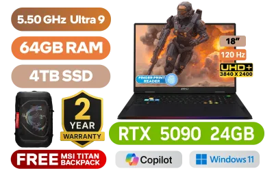 MSI Raider 18 HX AI A2XWJG-264ZA Intel® Core Ultra 9-285HX up to 5.50GHz Processor, 76MB Cache, 24x Cores, 24x Threads / 64GB DDR5 RAM / 4TB Ultra-Fast NVMe SSD / 18" UHD+ (3840x2400) Anti-Glare 120Hz Refresh-rate With IPS-Level Display / NVIDIA 50 Series GeForce RTX 5090 24GB GDDR7 Graphics With Desktop Level Performance / Windows 11 Home (64bit) / Killer Wi-Fi 7 BE1750x Wireless LAN / Bluetooth 5.4 / Fingerprint Reader / IR FHD type (30fps@1080p) with HDR Web Camera / 3 x Type-A USB 3.2 / 2 x USB Type-C Thunderbolt 5 (DisplayPort / Power Delivery 3.1) / 1 x HDMI (8K @ 60Hz / 4K @ 120Hz) / 1 x Headphone and Microphone Combo Jack / 1 x RJ-45 Ethernet Lan / 1x SD Card Reader / 6-speaker surround sound system by Dynaudio / 4x 2W Speaker; 2x 2W Woofer / Steelseries Per Key RGB Backlit Gaming Keyboard With Copilot Key / Advance Cooler Boosts 5 Cooling System / FREE MSI Titan Gaming Backpack / 2 Year MSI Warranty / MSI Raider 18 HX AI A2XWJG Intel Core Ultra 9 RTX 5090 Gaming LaptopMSI Raider 18 HX AI A2XWJG-264ZA Intel® Core Ultra 9-285HX up to 5.50GHz Processor, 76MB Cache, 24x Cores, 24x Threads / 64GB DDR5 RAM / 4TB Ultra-Fast NVMe SSD / 18" UHD+ (3840x2400) Anti-Glare 120Hz Refresh-rate With IPS-Level Display / NVIDIA 50 Series GeForce RTX 5090 24GB GDDR7 Graphics With Desktop Level Performance / Windows 11 Home (64bit) / Killer Wi-Fi 7 BE1750x Wireless LAN / Bluetooth 5.4 / Fingerprint Reader / IR FHD type (30fps@1080p) with HDR Web Camera / 3 x Type-A USB 3.2 / 2 x USB Type-C Thunderbolt 5 (DisplayPort / Power Delivery 3.1) / 1 x HDMI (8K @ 60Hz / 4K @ 120Hz) / 1 x Headphone and Microphone Combo Jack / 1 x RJ-45 Ethernet Lan / 1x SD Card Reader / 6-speaker surround sound system by Dynaudio / 4x 2W Speaker; 2x 2W Woofer / Steelseries Per Key RGB Backlit Gaming Keyboard With Copilot Key / Advance Cooler Boosts 5 Cooling System / FREE MSI Titan Gaming Backpack / 2 Year MSI Warranty / MSI Raider 18 HX AI A2XWJG Intel Core Ultra 9 RTX 5090 Gaming Laptop [RAIDER-18-HX-AI-A2XWJG-264ZA/4TB] / [+]Get Resident Evil: Requiem with select GeForce RTX 50 Series (Standard Edition)+ FREE DELIVERY !
