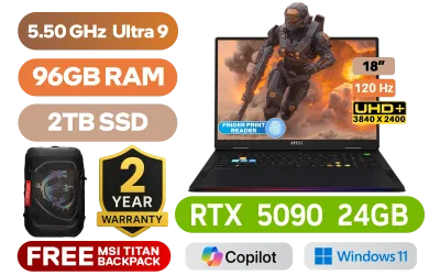 MSI Raider 18 HX AI A2XWJG-264ZA Intel® Core Ultra 9-285HX up to 5.50GHz Processor, 76MB Cache, 24x Cores, 24x Threads / 96GB DDR5 RAM / 2TB Ultra-Fast NVMe SSD / 18" UHD+ (3840x2400) Anti-Glare 120Hz Refresh-rate With IPS-Level Display / NVIDIA 50 Series GeForce RTX 5090 24GB GDDR7 Graphics With Desktop Level Performance / Windows 11 Home (64bit) / Killer Wi-Fi 7 BE1750x Wireless LAN / Bluetooth 5.4 / Fingerprint Reader / IR FHD type (30fps@1080p) with HDR Web Camera / 3 x Type-A USB 3.2 / 2 x USB Type-C Thunderbolt 5 (DisplayPort / Power Delivery 3.1) / 1 x HDMI (8K @ 60Hz / 4K @ 120Hz) / 1 x Headphone and Microphone Combo Jack / 1 x RJ-45 Ethernet Lan / 1x SD Card Reader / 6-speaker surround sound system by Dynaudio / 4x 2W Speaker; 2x 2W Woofer / Steelseries Per Key RGB Backlit Gaming Keyboard With Copilot Key / Advance Cooler Boosts 5 Cooling System / FREE MSI Titan Gaming Backpack / 2 Year MSI Warranty / MSI Raider 18 HX AI A2XWJG Intel Core Ultra 9 RTX 5090 Gaming LaptopMSI Raider 18 HX AI A2XWJG-264ZA Intel® Core Ultra 9-285HX up to 5.50GHz Processor, 76MB Cache, 24x Cores, 24x Threads / 96GB DDR5 RAM / 2TB Ultra-Fast NVMe SSD / 18" UHD+ (3840x2400) Anti-Glare 120Hz Refresh-rate With IPS-Level Display / NVIDIA 50 Series GeForce RTX 5090 24GB GDDR7 Graphics With Desktop Level Performance / Windows 11 Home (64bit) / Killer Wi-Fi 7 BE1750x Wireless LAN / Bluetooth 5.4 / Fingerprint Reader / IR FHD type (30fps@1080p) with HDR Web Camera / 3 x Type-A USB 3.2 / 2 x USB Type-C Thunderbolt 5 (DisplayPort / Power Delivery 3.1) / 1 x HDMI (8K @ 60Hz / 4K @ 120Hz) / 1 x Headphone and Microphone Combo Jack / 1 x RJ-45 Ethernet Lan / 1x SD Card Reader / 6-speaker surround sound system by Dynaudio / 4x 2W Speaker; 2x 2W Woofer / Steelseries Per Key RGB Backlit Gaming Keyboard With Copilot Key / Advance Cooler Boosts 5 Cooling System / FREE MSI Titan Gaming Backpack / 2 Year MSI Warranty / MSI Raider 18 HX AI A2XWJG Intel Core Ultra 9 RTX 5090 Gaming Laptop [RAIDER-18-HX-AI-A2XWJG-264ZA/96GB] / [+]Get Resident Evil Requiem with select GeForce RTX 50 Series (Standard Edition)+ FREE DELIVERY !