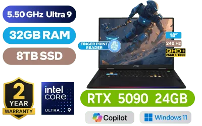 MSI Raider 18 HX AI A2XWJG-264ZA Intel® Core Ultra 9-285HX up to 5.50GHz Processor, 76MB Cache, 24x Cores, 24x Threads / 32GB DDR5 RAM / 8TB Ultra-Fast NVMe SSD / 18" QHD+ (2560x1600) 240Hz Anti-Glare IPS-Level Display / NVIDIA 50 Series GeForce RTX 5090 24GB GDDR7 Graphics Card / Windows 11 Home (64bit) / Intel Killer Wi-Fi 7 BE1750x Wireless LAN / Bluetooth 5.4 / 1080p FHD IR Camera with Privacy Shutter / 3x USB Type-A / 2 x USB Type-C (Supports Thunderbolt 5 / DisplayPort / Power Delivery 3.1) / 1 x HDMI / 1 x Headphone and Microphone Combo Jack / 1x RJ45 / 1x SD Card Reader / Fingerprint Reader / SteelSeries RGB Backlit Keyboard / 4x 2W Speaker and 2x 2W Woofer Audio System / 2 Year MSI Warranty / MSI Raider 18 HX AI A2XWJG Core Ultra 9 RTX 5090 Gaming LaptopMSI Raider 18 HX AI A2XWJG-264ZA Intel® Core Ultra 9-285HX up to 5.50GHz Processor, 76MB Cache, 24x Cores, 24x Threads / 32GB DDR5 RAM / 8TB Ultra-Fast NVMe SSD / 18" QHD+ (2560x1600) 240Hz Anti-Glare IPS-Level Display / NVIDIA 50 Series GeForce RTX 5090 24GB GDDR7 Graphics Card / Windows 11 Home (64bit) / Intel Killer Wi-Fi 7 BE1750x Wireless LAN / Bluetooth 5.4 / 1080p FHD IR Camera with Privacy Shutter / 3x USB Type-A / 2 x USB Type-C (Supports Thunderbolt 5 / DisplayPort / Power Delivery 3.1) / 1 x HDMI / 1 x Headphone and Microphone Combo Jack / 1x RJ45 / 1x SD Card Reader / Fingerprint Reader / SteelSeries RGB Backlit Keyboard / 4x 2W Speaker and 2x 2W Woofer Audio System / 2 Year MSI Warranty / MSI Raider 18 HX AI A2XWJG Core Ultra 9 RTX 5090 Gaming Laptop [Raider-18-HX-AI-A2XWJG-895ZA/8TB] / [+]Get Resident Evil Requiem with select GeForce RTX 50 Series (Standard Edition)+ FREE DELIVERY !