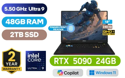 MSI Raider 18 HX AI A2XWJG-264ZA Intel® Core Ultra 9-285HX up to 5.50GHz Processor, 76MB Cache, 24x Cores, 24x Threads / 48GB DDR5 RAM / 2TB Ultra-Fast NVMe SSD / 18" QHD+ (2560x1600) 240Hz Anti-Glare IPS-Level Display / NVIDIA 50 Series GeForce RTX 5090 24GB GDDR7 Graphics Card / Windows 11 Home (64bit) / Intel Killer Wi-Fi 7 BE1750x Wireless LAN / Bluetooth 5.4 / 1080p FHD IR Camera with Privacy Shutter / 3x USB Type-A / 2 x USB Type-C (Supports Thunderbolt 5 / DisplayPort / Power Delivery 3.1) / 1 x HDMI / 1 x Headphone and Microphone Combo Jack / 1x RJ45 / 1x SD Card Reader / Fingerprint Reader / SteelSeries RGB Backlit Keyboard / 4x 2W Speaker and 2x 2W Woofer Audio System / 2 Year MSI Warranty / MSI Raider 18 HX AI A2XWJG Core Ultra 9 RTX 5090 Gaming LaptopMSI Raider 18 HX AI A2XWJG-264ZA Intel® Core Ultra 9-285HX up to 5.50GHz Processor, 76MB Cache, 24x Cores, 24x Threads / 48GB DDR5 RAM / 2TB Ultra-Fast NVMe SSD / 18" QHD+ (2560x1600) 240Hz Anti-Glare IPS-Level Display / NVIDIA 50 Series GeForce RTX 5090 24GB GDDR7 Graphics Card / Windows 11 Home (64bit) / Intel Killer Wi-Fi 7 BE1750x Wireless LAN / Bluetooth 5.4 / 1080p FHD IR Camera with Privacy Shutter / 3x USB Type-A / 2 x USB Type-C (Supports Thunderbolt 5 / DisplayPort / Power Delivery 3.1) / 1 x HDMI / 1 x Headphone and Microphone Combo Jack / 1x RJ45 / 1x SD Card Reader / Fingerprint Reader / SteelSeries RGB Backlit Keyboard / 4x 2W Speaker and 2x 2W Woofer Audio System / 2 Year MSI Warranty / MSI Raider 18 HX AI A2XWJG Core Ultra 9 RTX 5090 Gaming Laptop [Raider-18-HX-AI-A2XWJG-895ZA/48GB] / [+]Get Resident Evil Requiem with select GeForce RTX 50 Series (Standard Edition)+ FREE DELIVERY !