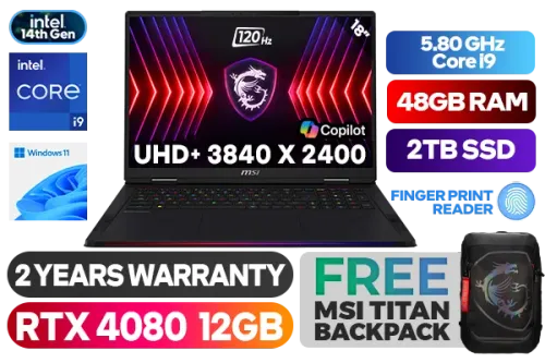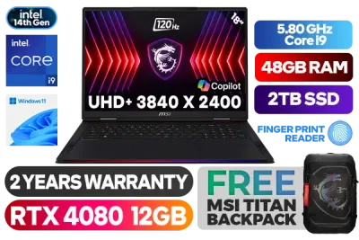 MSI Raider 18HX 14th Gen Intel Core i9-14900HX up to 5.80GHz Processor, 36MB Cache, 24x Cores, 32x Threads / 48GB DDR5 RAM / 2TB Ultra-Fast NVMe SSD / 18" UHD+ (3840x2400) Anti-Glare 120Hz IPS-Level Display / NVIDIA 40 Series GeForce RTX 4080 12GB GDDR6 Dedicated Graphics / Windows 11 Home (64bit) / Killer Wi-Fi 7 BE1750X Wireless LAN / Bluetooth 5.4 / IR FHD (30fps@1080p) Web Camera / Steelseries Per Key RGB Backlit Gaming Keyboard / Fingerprint Reader / 3x USB Type-A / 2x USB Type-C (Thunderbolt™ 4) / 1 x HDMI 2.1 / 1 x Headphone and Microphone Combo Jack / 1 x SD Card Reader / 1x RJ45 / 4x 2W Speaker; 2x 2W Woofer / FREE MSI Titan Gaming Backpack / 2 Years Warranty / MSI Raider 18HX 14th Gen Core i9 RTX 4080 Gaming Laptop DealMSI Raider 18HX 14th Gen Intel Core i9-14900HX up to 5.80GHz Processor, 36MB Cache, 24x Cores, 32x Threads / 48GB DDR5 RAM / 2TB Ultra-Fast NVMe SSD / 18" UHD+ (3840x2400) Anti-Glare 120Hz IPS-Level Display / NVIDIA 40 Series GeForce RTX 4080 12GB GDDR6 Dedicated Graphics / Windows 11 Home (64bit) / Killer Wi-Fi 7 BE1750X Wireless LAN / Bluetooth 5.4 / IR FHD (30fps@1080p) Web Camera / Steelseries Per Key RGB Backlit Gaming Keyboard / Fingerprint Reader / 3x USB Type-A / 2x USB Type-C (Thunderbolt™ 4) / 1 x HDMI 2.1 / 1 x Headphone and Microphone Combo Jack / 1 x SD Card Reader / 1x RJ45 / 4x 2W Speaker; 2x 2W Woofer / FREE MSI Titan Gaming Backpack / 2 Years Warranty / MSI Raider 18HX 14th Gen Core i9 RTX 4080 Gaming Laptop Deal [RAIDER-18-HX-A14VHG-470ZA/48GB] + FREE DELIVERY !
