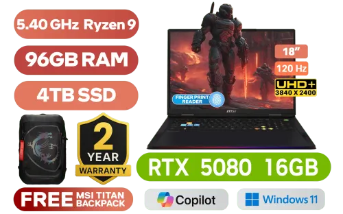 MSI Raider A18 HX A9WIG AMD Ryzen 9-9955HX3D up to 5.40GHz Processor, 144MB Cache, 16x Cores, 32x Threads / 96GB DDR5 RAM / 4TB Ultra-Fast NVMe SSD / 18" UHD+ (3840x2400) Anti-Glare 120Hz IPS-Level Display / NVIDIA 50 Series GeForce RTX 5080 16GB GDDR7 Graphics With Desktop Level Performance / Windows 11 Home (64bit) / MediaTek Wi-Fi 7 MT7925 Wireless LAN / Bluetooth v5.4 / Fingerprint Reader / 1080P FHD IR Camera With Privacy Shutter / 3 x USB Type-A / 2 x USB Type-C / 1 x HDMI / 1 x Headphone and Microphone Combo Jack / 1 x RJ-45 Ethernet Lan / 1x SD Card Reader / Surround Sound System by Dynaudio / Steelseries Per Key RGB Backlit Gaming Keyboard / FREE MSI Titan Gaming Backpack / 2 Year MSI Warranty / MSI Raider A18 HX A9WIG AMD Ryzen 9 RTX 5080 Gaming LaptopMSI Raider A18 HX A9WIG AMD Ryzen 9-9955HX3D up to 5.40GHz Processor, 144MB Cache, 16x Cores, 32x Threads / 96GB DDR5 RAM / 4TB Ultra-Fast NVMe SSD / 18" UHD+ (3840x2400) Anti-Glare 120Hz IPS-Level Display / NVIDIA 50 Series GeForce RTX 5080 16GB GDDR7 Graphics With Desktop Level Performance / Windows 11 Home (64bit) / MediaTek Wi-Fi 7 MT7925 Wireless LAN / Bluetooth v5.4 / Fingerprint Reader / 1080P FHD IR Camera With Privacy Shutter / 3 x USB Type-A / 2 x USB Type-C / 1 x HDMI / 1 x Headphone and Microphone Combo Jack / 1 x RJ-45 Ethernet Lan / 1x SD Card Reader / Surround Sound System by Dynaudio / Steelseries Per Key RGB Backlit Gaming Keyboard / FREE MSI Titan Gaming Backpack / 2 Year MSI Warranty / MSI Raider A18 HX A9WIG AMD Ryzen 9 RTX 5080 Gaming Laptop [RAIDER-A18-HX-A9WIG-028ZA/96GB/4TB] / [+]Get Resident Evil: Requiem with select GeForce RTX 50 Series (Standard Edition) / [+] Get Crimson Desert with select AMD Mobile products+ FREE DELIVERY !