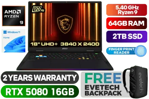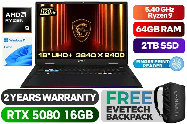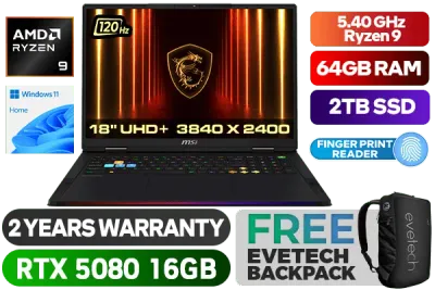 MSI Raider A18 HX A9WIG-028ZA AMD Ryzen 9-9955HX3D up to 5.40GHz Processor, 144MB Cache, 16x Cores, 32x Threads / 64GB DDR5 RAM / 2TB Ultra-Fast NVMe SSD / 18" UHD+ (3840x2400) Anti-Glare 120Hz Refresh-rate With IPS-Level Display / NVIDIA 50 Series GeForce RTX 5080 16GB GDDR7 Graphics With Desktop Level Performance / Windows 11 Home (64bit) / Wi-Fi 7 Wireless LAN / Bluetooth v5.4 / Fingerprint Reader / IR FHD type (30fps@1080p) with HDR Web Camera / 3 x Type-A USB 3.2 / 2 x USB Type-C Thunderbolt 4 (DisplayPort / Power Delivery 3.1) / 1 x HDMI (8K @ 60Hz / 4K @ 120Hz ) / 1 x Headphone and Microphone Combo Jack / 1 x RJ-45 Ethernet Lan / 1x SD Express Card Reader / Virtual Surround Sound Powered by Nahimic 3 / 4x 2W Speaker; 2x 2W Woofer / Steelseries Per Key RGB Backlit Gaming Keyboard With Copilot Key / Advance Cooler Boosts 5 Cooling System / 2 Year MSI Warranty / MSI Raider A18 HX A9WIG AMD Ryzen 9 RTX 5080 Gaming LaptopMSI Raider A18 HX A9WIG-028ZA AMD Ryzen 9-9955HX3D up to 5.40GHz Processor, 144MB Cache, 16x Cores, 32x Threads / 64GB DDR5 RAM / 2TB Ultra-Fast NVMe SSD / 18" UHD+ (3840x2400) Anti-Glare 120Hz Refresh-rate With IPS-Level Display / NVIDIA 50 Series GeForce RTX 5080 16GB GDDR7 Graphics With Desktop Level Performance / Windows 11 Home (64bit) / Wi-Fi 7 Wireless LAN / Bluetooth v5.4 / Fingerprint Reader / IR FHD type (30fps@1080p) with HDR Web Camera / 3 x Type-A USB 3.2 / 2 x USB Type-C Thunderbolt 4 (DisplayPort / Power Delivery 3.1) / 1 x HDMI (8K @ 60Hz / 4K @ 120Hz ) / 1 x Headphone and Microphone Combo Jack / 1 x RJ-45 Ethernet Lan / 1x SD Express Card Reader / Virtual Surround Sound Powered by Nahimic 3 / 4x 2W Speaker; 2x 2W Woofer / Steelseries Per Key RGB Backlit Gaming Keyboard With Copilot Key / Advance Cooler Boosts 5 Cooling System / 2 Year MSI Warranty / MSI Raider A18 HX A9WIG AMD Ryzen 9 RTX 5080 Gaming Laptop [Raider A18 HX A9WIG] / [+] GET FREE EVETECH NEO Premium Gaming Backpack+ FREE DELIVERY !