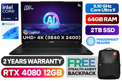 MSI Stealth 18 AI Studio Intel Core Ultra 9 185H up to 5.10GHz Processor, 24MB Cache, 16x Cores, 22x Threads / 64GB DDR5 RAM / 2TB Ultra-Fast NVME SSD / 18" UHD+ 4K (3840 x 2400) 120Hz Anti-Glare IPS-Level Display / NVIDIA 40 Series GeForce RTX 4080 12GB GDDR6 Dedicated Graphics / Windows 11 Home (64bit) / Steelseries Per Key RGB Backlit Gaming Keyboard / 1080p FHD IR Web Camera / Bluetooth 5.4 / Intel Killer Wi-Fi 7 BE1750X Wireless LAN / 1 x Mic-in/Headphone-out Combo Jack / 2 x USB Type-A / 1x Type-C (USB3.2 Gen2 / DisplayPort™) / 1x USB Type-C Thunderbolt 4 / 1 x HDMI / 1x RJ45 / 1x SD Card Reader / Fingerprint Reader / 2x 2W Speaker with 4x 2W Woofer / 2 Years Warranty / FREE MSI Stealth Agent Backpack / MSI Stealth 18 AI Studio Core Ultra 9 RTX 4080 Gaming Laptop DealMSI Stealth 18 AI Studio Intel Core Ultra 9 185H up to 5.10GHz Processor, 24MB Cache, 16x Cores, 22x Threads / 64GB DDR5 RAM / 2TB Ultra-Fast NVME SSD / 18" UHD+ 4K (3840 x 2400) 120Hz Anti-Glare IPS-Level Display / NVIDIA 40 Series GeForce RTX 4080 12GB GDDR6 Dedicated Graphics / Windows 11 Home (64bit) / Steelseries Per Key RGB Backlit Gaming Keyboard / 1080p FHD IR Web Camera / Bluetooth 5.4 / Intel Killer Wi-Fi 7 BE1750X Wireless LAN / 1 x Mic-in/Headphone-out Combo Jack / 2 x USB Type-A / 1x Type-C (USB3.2 Gen2 / DisplayPort™) / 1x USB Type-C Thunderbolt 4 / 1 x HDMI / 1x RJ45 / 1x SD Card Reader / Fingerprint Reader / 2x 2W Speaker with 4x 2W Woofer / 2 Years Warranty / FREE MSI Stealth Agent Backpack / MSI Stealth 18 AI Studio Core Ultra 9 RTX 4080 Gaming Laptop Deal [STEALTH-18-AI-STUDIO-A1VHG-082ZA/64GB/2TB] + FREE DELIVERY !