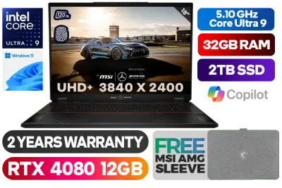 MSI STEALTH 18 Mercedes AMG A1VHG-065ZA Ultra 9-185H up to 5.10GHz Processor, 24MB Cache, 16x Cores, 22x Threads / 32GB DDR5 RAM / 2TB Ultra-Fast NVME SSD / 18" UHD+ (3840 x 2400) MiniLED 120Hz Display / NVIDIA 40 Series GeForce RTX 4080 12GB GDDR6 Dedicated Graphics / Windows 11 Home (64bit) / Per-Key RGB Gaming Keyboard by SteelSeries with Copilot Key / IR FHD type (30fps@1080p) / Bluetooth 5.4 / Intel® Killer™ BE Wi-Fi 7 Wireless LAN / 1 x Mic-in/Headphone-out Combo Jack / 1x USB3.2 Type-C (DP) / 1x USB Type-C (Thunderbolt 4, DP) with PD3.1 charging / 2x USB 3.2 Type-A / 1 x HDMI / 1x RJ45 / 1 x SD Card Reader / Nahimic Next Level Audio / Fingerprint Reader / 2 Years Warranty / Free Msi Sleeve / MSI STEALTH 18 Mercedes AMG A1VHG Core Ultra 9 RTX 4080 Gaming Laptop DealMSI STEALTH 18 Mercedes AMG A1VHG-065ZA Ultra 9-185H up to 5.10GHz Processor, 24MB Cache, 16x Cores, 22x Threads / 32GB DDR5 RAM / 2TB Ultra-Fast NVME SSD / 18" UHD+ (3840 x 2400) MiniLED 120Hz Display / NVIDIA 40 Series GeForce RTX 4080 12GB GDDR6 Dedicated Graphics / Windows 11 Home (64bit) / Per-Key RGB Gaming Keyboard by SteelSeries with Copilot Key / IR FHD type (30fps@1080p) / Bluetooth 5.4 / Intel® Killer™ BE Wi-Fi 7 Wireless LAN / 1 x Mic-in/Headphone-out Combo Jack / 1x USB3.2 Type-C (DP) / 1x USB Type-C (Thunderbolt 4, DP) with PD3.1 charging / 2x USB 3.2 Type-A / 1 x HDMI / 1x RJ45 / 1 x SD Card Reader / Nahimic Next Level Audio / Fingerprint Reader / 2 Years Warranty / Free Msi Sleeve / MSI STEALTH 18 Mercedes AMG A1VHG Core Ultra 9 RTX 4080 Gaming Laptop Deal [STEALTH-18-MERCEDESAMG A1VHG-065ZA] + FREE DELIVERY !