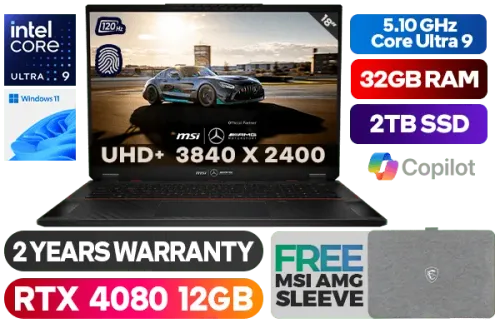MSI STEALTH 18 Mercedes AMG A1VHG-065ZA Ultra 9-185H up to 5.10GHz Processor, 24MB Cache, 16x Cores, 22x Threads / 32GB DDR5 RAM / 2TB Ultra-Fast NVME SSD / 18" UHD+ (3840 x 2400) MiniLED 120Hz Display / NVIDIA 40 Series GeForce RTX 4080 12GB GDDR6 Dedicated Graphics / Windows 11 Home (64bit) / Per-Key RGB Gaming Keyboard by SteelSeries with Copilot Key / IR FHD type (30fps@1080p) / Bluetooth 5.4 / Intel® Killer™ BE Wi-Fi 7 Wireless LAN / 1 x Mic-in/Headphone-out Combo Jack / 1x USB3.2 Type-C (DP) / 1x USB Type-C (Thunderbolt 4, DP) with PD3.1 charging / 2x USB 3.2 Type-A / 1 x HDMI / 1x RJ45 / 1 x SD Card Reader / Nahimic Next Level Audio / Fingerprint Reader / 2 Years Warranty / Free Msi Sleeve / MSI STEALTH 18 Mercedes AMG A1VHG Core Ultra 9 RTX 4080 Gaming Laptop DealMSI STEALTH 18 Mercedes AMG A1VHG-065ZA Ultra 9-185H up to 5.10GHz Processor, 24MB Cache, 16x Cores, 22x Threads / 32GB DDR5 RAM / 2TB Ultra-Fast NVME SSD / 18" UHD+ (3840 x 2400) MiniLED 120Hz Display / NVIDIA 40 Series GeForce RTX 4080 12GB GDDR6 Dedicated Graphics / Windows 11 Home (64bit) / Per-Key RGB Gaming Keyboard by SteelSeries with Copilot Key / IR FHD type (30fps@1080p) / Bluetooth 5.4 / Intel® Killer™ BE Wi-Fi 7 Wireless LAN / 1 x Mic-in/Headphone-out Combo Jack / 1x USB3.2 Type-C (DP) / 1x USB Type-C (Thunderbolt 4, DP) with PD3.1 charging / 2x USB 3.2 Type-A / 1 x HDMI / 1x RJ45 / 1 x SD Card Reader / Nahimic Next Level Audio / Fingerprint Reader / 2 Years Warranty / Free Msi Sleeve / MSI STEALTH 18 Mercedes AMG A1VHG Core Ultra 9 RTX 4080 Gaming Laptop Deal [STEALTH-18-MERCEDESAMG A1VHG-065ZA] + FREE DELIVERY !