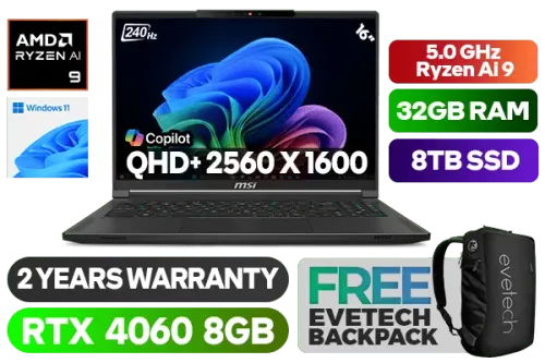MSI Stealth A16 A3HVFG AMD Ryzen AI 9 365 up to 5.0GHz Processor, 34MB Cache, 10x Cores, 20x Threads / 32GB LPDDR5X RAM / 8TB Ultra-Fast NVME SSD / 16" QHD+ (2560x1600) 240Hz Anti-Glare IPS-Level Display / GeForce RTX 4060 8GB GDDR6 Dedicated Graphics / Windows 11 Home (64bit) / Per-Key RGB Steelseries Gaming Keyboard / 1080p FHD IR Webcam / Qualcomm FastConnect 7800 Wi-Fi 7 Wireless LAN / Bluetooth 5.4 / 1 x HDMI 2.1 / 2 x USB 3.2 Type-A / 1 x USB Type-C (USB4® / DisplayPort™/ Power Delivery 3.0/ Thunderbolt™ 4 compatible) / 1x RJ45 / 1x Audio & Microphone Combo Jack / Fingerprint Print Reader / 2 Years Warranty / MSI Stealth A16 AI+ Ryzen AI 9 RTX 4060 Gaming LaptopMSI Stealth A16 A3HVFG AMD Ryzen AI 9 365 up to 5.0GHz Processor, 34MB Cache, 10x Cores, 20x Threads / 32GB LPDDR5X RAM / 8TB Ultra-Fast NVME SSD / 16" QHD+ (2560x1600) 240Hz Anti-Glare IPS-Level Display / GeForce RTX 4060 8GB GDDR6 Dedicated Graphics / Windows 11 Home (64bit) / Per-Key RGB Steelseries Gaming Keyboard / 1080p FHD IR Webcam / Qualcomm FastConnect 7800 Wi-Fi 7 Wireless LAN / Bluetooth 5.4 / 1 x HDMI 2.1 / 2 x USB 3.2 Type-A / 1 x USB Type-C (USB4® / DisplayPort™/ Power Delivery 3.0/ Thunderbolt™ 4 compatible) / 1x RJ45 / 1x Audio & Microphone Combo Jack / Fingerprint Print Reader / 2 Years Warranty / MSI Stealth A16 AI+ Ryzen AI 9 RTX 4060 Gaming Laptop [STEALTH-A16-AI-A3HVFG-257ZA/8TB] / [+] GET FREE EVETECH NEO Premium Gaming Backpack+ FREE DELIVERY !