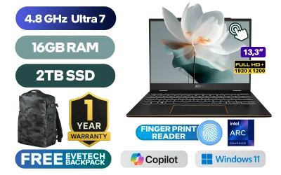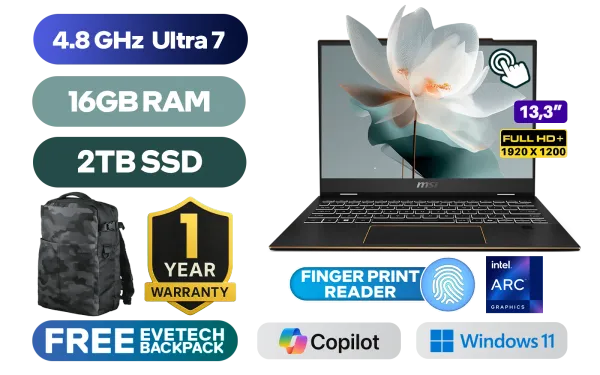 [TOUCHSCREEN] MSI Summit 13 AI+ Evo A2VMTG Intel Core Ultra 7 256V up to 4.8GHz Processor, 12MB Cache, 8x Cores, 8x Threads / 16GB LPDDR5X RAM / 2TB Ultra-Fast NVMe SSD / 13.3" FHD+ (1920 x 1200) IPS Level Touchscreen Display / Intel Arc 140V Integrated Graphics / Windows 11 Home (64bit) / Intel Killer Wi-Fi 7 BE1750 Wireless LAN / Bluetooth 5.4 / White Backlit Keyboard / 1080p FHD IR Webcam / Finger Print Reader / 1x USB 3.2 Type-A / 2x USB Type-C Thunderbolt™4 (DisplayPort / Power Delivery 3.0) / 1x HDMI 2.1 / 1x Mic-in/Headphone-out Combo Jack / + FREE MSI Pen 2 / 1 Year Warranty / MSI Summit 13 AI+ Ultra 7 Laptop Deal[TOUCHSCREEN] MSI Summit 13 AI+ Evo A2VMTG Intel Core Ultra 7 256V up to 4.8GHz Processor, 12MB Cache, 8x Cores, 8x Threads / 16GB LPDDR5X RAM / 2TB Ultra-Fast NVMe SSD / 13.3" FHD+ (1920 x 1200) IPS Level Touchscreen Display / Intel Arc 140V Integrated Graphics / Windows 11 Home (64bit) / Intel Killer Wi-Fi 7 BE1750 Wireless LAN / Bluetooth 5.4 / White Backlit Keyboard / 1080p FHD IR Webcam / Finger Print Reader / 1x USB 3.2 Type-A / 2x USB Type-C Thunderbolt™4 (DisplayPort / Power Delivery 3.0) / 1x HDMI 2.1 / 1x Mic-in/Headphone-out Combo Jack / + FREE MSI Pen 2 / 1 Year Warranty / MSI Summit 13 AI+ Ultra 7 Laptop Deal [SUMMIT-13-AI-EVO-A2VMTG-028ZA/2TB] / [+] GET FREE EVETECH DASH Premium Gaming Backpack+ FREE DELIVERY !