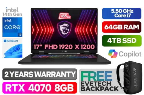 MSI Sword 17 HX B14V 14th Gen Intel Core i7-14700HX up to 5.50GHz Processor, 33MB Cache, 20x Cores, 28x Threads / 64GB DDR5 RAM / 4TB Ultra-Fast NVMe SSD / 17" FHD+ (1920x1200) 165Hz Refresh-rate With IPS-Level Display / NVIDIA GeForce RTX 4070 8GB GDDR6 Dedicated Graphics / Windows 11 Home (64bit) / Intel® Wi-Fi 6E Wireless LAN / Bluetooth v5.3 / 1x RJ-45 / HD type (30fps@720p) HDR Web Camera / 24-Zone RGB Backlit Gaming Keyboard / 3x Type-A USB 3.2 / 1x USB Type-C Thunderbolt 4 support DisplayPort / 1x HDMI™ 2.1 (8K @ 60Hz / 4K @ 120Hz) / 1 x Headphone and Microphone Combo Jack / 2x 2W Speakers / 2 Year MSI Warranty / MSI Sword 17 HX B14V Core i7 RTX 4070 Gaming Laptop DealMSI Sword 17 HX B14V 14th Gen Intel Core i7-14700HX up to 5.50GHz Processor, 33MB Cache, 20x Cores, 28x Threads / 64GB DDR5 RAM / 4TB Ultra-Fast NVMe SSD / 17" FHD+ (1920x1200) 165Hz Refresh-rate With IPS-Level Display / NVIDIA GeForce RTX 4070 8GB GDDR6 Dedicated Graphics / Windows 11 Home (64bit) / Intel® Wi-Fi 6E Wireless LAN / Bluetooth v5.3 / 1x RJ-45 / HD type (30fps@720p) HDR Web Camera / 24-Zone RGB Backlit Gaming Keyboard / 3x Type-A USB 3.2 / 1x USB Type-C Thunderbolt 4 support DisplayPort / 1x HDMI™ 2.1 (8K @ 60Hz / 4K @ 120Hz) / 1 x Headphone and Microphone Combo Jack / 2x 2W Speakers / 2 Year MSI Warranty / MSI Sword 17 HX B14V Core i7 RTX 4070 Gaming Laptop Deal [SWORD-17-HX-B14VGKG-021ZA/64GB/4TB] / [+] GET FREE EVETECH NEO Premium Gaming Backpack+ FREE DELIVERY !