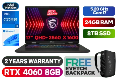 MSI Sword 17 HX B14VFKG 14th Gen Intel® Core™ i7-14650HX up to 5.20GHz Processor, 30MB Cache, 16x Cores, 24x Threads / 24GB DDR5 RAM / 8TB Ultra-Fast NVMe SSD / 17" QHD+ (2560x1600) 240Hz IPS-Level Display / NVIDIA® GeForce RTX™ 4060 8GB GDDR6 Dedicated Graphics / Windows 11 Home (64bit) / Intel® Wi-Fi 6E Wireless LAN / Bluetooth v5.3 / 720p HD Web Camera / 24-Zone RGB Backlit Gaming Keyboard / 3x USB Type-A / 1x USB Type-C (USB3.2 Gen2 / DisplayPort™/ Power Delivery 3.0) / 1x HDMI™ 2.1 / 1 x Headphone and Microphone Combo Jack / 1x RJ-45 / 2x 2W Speakers / 2 Years Warranty / MSI Sword 17 HX B14VFKG Intel® Core™ i7 RTX 4060 Gaming Laptop DealMSI Sword 17 HX B14VFKG 14th Gen Intel® Core™ i7-14650HX up to 5.20GHz Processor, 30MB Cache, 16x Cores, 24x Threads / 24GB DDR5 RAM / 8TB Ultra-Fast NVMe SSD / 17" QHD+ (2560x1600) 240Hz IPS-Level Display / NVIDIA® GeForce RTX™ 4060 8GB GDDR6 Dedicated Graphics / Windows 11 Home (64bit) / Intel® Wi-Fi 6E Wireless LAN / Bluetooth v5.3 / 720p HD Web Camera / 24-Zone RGB Backlit Gaming Keyboard / 3x USB Type-A / 1x USB Type-C (USB3.2 Gen2 / DisplayPort™/ Power Delivery 3.0) / 1x HDMI™ 2.1 / 1 x Headphone and Microphone Combo Jack / 1x RJ-45 / 2x 2W Speakers / 2 Years Warranty / MSI Sword 17 HX B14VFKG Intel® Core™ i7 RTX 4060 Gaming Laptop Deal [SWORD-17-HX-B14VFKG-260ZA/24GB/8TB] / [+] GET FREE EVETECH NEO Premium Gaming Backpack+ FREE DELIVERY !