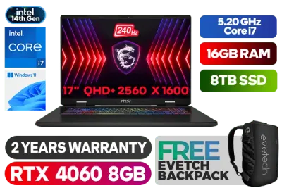MSI Sword 17 HX B14VFKG 14th Gen Intel® Core™ i7-14650HX up to 5.20GHz Processor, 30MB Cache, 16x Cores, 24x Threads / 16GB DDR5 RAM / 8TB Ultra-Fast NVMe SSD / 17" QHD+ (2560x1600) 240Hz IPS-Level Display / NVIDIA® GeForce RTX™ 4060 8GB GDDR6 Dedicated Graphics / Windows 11 Home (64bit) / Intel® Wi-Fi 6E Wireless LAN / Bluetooth v5.3 / 720p HD Web Camera / 24-Zone RGB Backlit Gaming Keyboard / 3x USB Type-A / 1x USB Type-C (USB3.2 Gen2 / DisplayPort™/ Power Delivery 3.0) / 1x HDMI™ 2.1 / 1 x Headphone and Microphone Combo Jack / 1x RJ-45 / 2x 2W Speakers / 2 Years Warranty / MSI Sword 17 HX B14VFKG Intel® Core™ i7 RTX 4060 Gaming Laptop DealMSI Sword 17 HX B14VFKG 14th Gen Intel® Core™ i7-14650HX up to 5.20GHz Processor, 30MB Cache, 16x Cores, 24x Threads / 16GB DDR5 RAM / 8TB Ultra-Fast NVMe SSD / 17" QHD+ (2560x1600) 240Hz IPS-Level Display / NVIDIA® GeForce RTX™ 4060 8GB GDDR6 Dedicated Graphics / Windows 11 Home (64bit) / Intel® Wi-Fi 6E Wireless LAN / Bluetooth v5.3 / 720p HD Web Camera / 24-Zone RGB Backlit Gaming Keyboard / 3x USB Type-A / 1x USB Type-C (USB3.2 Gen2 / DisplayPort™/ Power Delivery 3.0) / 1x HDMI™ 2.1 / 1 x Headphone and Microphone Combo Jack / 1x RJ-45 / 2x 2W Speakers / 2 Years Warranty / MSI Sword 17 HX B14VFKG Intel® Core™ i7 RTX 4060 Gaming Laptop Deal [SWORD-17-HX-B14VFKG-260ZA/8TB] / [+] GET FREE EVETECH NEO Premium Gaming Backpack+ FREE DELIVERY !