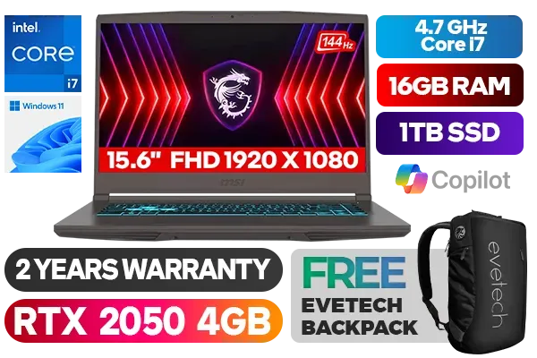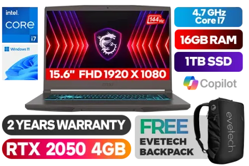 MSI THIN 15 B12UCX 12th Gen Intel Core i7-12650H up to 4.7GHz Processor, 24MB Cache, 10x Cores, 16x Threads / 16GB DDR4 RAM / 1TB Ultra-Fast NVMe SSD / 15.6" FHD 1920x1080 144Hz IPS Level Display / NVIDIA GeForce RTX 2050 4GB GDDR6 Dedicated Graphics / Windows 11 Home 64bit / Blue Backlit Gaming Keyboard / HD Web Camera (30fps@720p) / Bluetooth v5.3 / Intel Wi-Fi 6E Wireless LAN / 3 x USB 3.2 Type-A / 1 x USB 3.2 Type-C / 1 x HDMI / 1x Microphone jack & 1x Headphone jack / Nahimic 3 Audio Boost + 2 x 2W Speaker / 2 Years Warranty / MSI THIN 15 B12UCX Core i7 12th Gen RTX 2050 Gaming Laptop DealMSI THIN 15 B12UCX 12th Gen Intel Core i7-12650H up to 4.7GHz Processor, 24MB Cache, 10x Cores, 16x Threads / 16GB DDR4 RAM / 1TB Ultra-Fast NVMe SSD / 15.6" FHD 1920x1080 144Hz IPS Level Display / NVIDIA GeForce RTX 2050 4GB GDDR6 Dedicated Graphics / Windows 11 Home 64bit / Blue Backlit Gaming Keyboard / HD Web Camera (30fps@720p) / Bluetooth v5.3 / Intel Wi-Fi 6E Wireless LAN / 3 x USB 3.2 Type-A / 1 x USB 3.2 Type-C / 1 x HDMI / 1x Microphone jack & 1x Headphone jack / Nahimic 3 Audio Boost + 2 x 2W Speaker / 2 Years Warranty / MSI THIN 15 B12UCX Core i7 12th Gen RTX 2050 Gaming Laptop Deal [MSI-THIN-15-B12UCX-1613ZA/1TB] / [+] GET FREE EVETECH NEO Premium Gaming Backpack+ FREE DELIVERY !