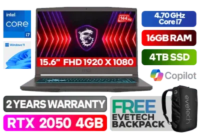 MSI THIN 15 B12UCX 12th Gen Intel Core i7-12650H up to 4.7GHz Processor, 24MB Cache, 10x Cores, 16x Threads / 16GB DDR4 RAM / 4TB Ultra-Fast NVMe SSD / 15.6" FHD 1920x1080 144Hz IPS Level Display / NVIDIA GeForce RTX 2050 4GB GDDR6 Dedicated Graphics / Windows 11 Home 64bit / Blue Backlit Gaming Keyboard / HD Web Camera (30fps@720p) / Bluetooth v5.3 / Intel Wi-Fi 6E Wireless LAN / 3 x USB 3.2 Type-A / 1 x USB 3.2 Type-C / 1 x HDMI / 1x Microphone jack & 1x Headphone jack / Nahimic 3 Audio Boost + 2 x 2W Speaker / 2 Years Warranty / MSI THIN 15 B12UCX Core i7 12th Gen RTX 2050 Gaming Laptop DealMSI THIN 15 B12UCX 12th Gen Intel Core i7-12650H up to 4.7GHz Processor, 24MB Cache, 10x Cores, 16x Threads / 16GB DDR4 RAM / 4TB Ultra-Fast NVMe SSD / 15.6" FHD 1920x1080 144Hz IPS Level Display / NVIDIA GeForce RTX 2050 4GB GDDR6 Dedicated Graphics / Windows 11 Home 64bit / Blue Backlit Gaming Keyboard / HD Web Camera (30fps@720p) / Bluetooth v5.3 / Intel Wi-Fi 6E Wireless LAN / 3 x USB 3.2 Type-A / 1 x USB 3.2 Type-C / 1 x HDMI / 1x Microphone jack & 1x Headphone jack / Nahimic 3 Audio Boost + 2 x 2W Speaker / 2 Years Warranty / MSI THIN 15 B12UCX Core i7 12th Gen RTX 2050 Gaming Laptop Deal [MSI-THIN-15-B12UCX-1613ZA/4TB] / [+] GET FREE EVETECH NEO Premium Gaming Backpack+ FREE DELIVERY !