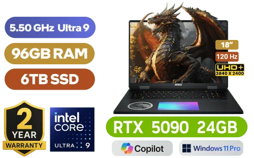 MSI Titan 18 HX A2XWJG Dragon Edition Norse Myth Intel® Core Ultra 9-285HX up to 5.50GHz Processor, 76MB Cache, 24x Cores, 24x Threads / 96GB DDR5 RAM / 6TB (3x 2TB) Ultra-Fast NVMe SSD / 18" UHD+ (3840x2400) Anti-Glare 120Hz Refresh-rate With IPS-Level Display / NVIDIA 50 Series GeForce RTX 5090 24GB GDDR7 Graphics With Desktop Level Performance / <span style="font-size: 20px; color: #00BFFF; font-weight: bold;">Windows 11 Professional (64bit)</span> / Killer Wi-Fi 7 B1750x Wireless LAN / Bluetooth v5.4 / IR FHD type (30fps@1080p) with HDR Web Camera / 3 x Type-A USB 3.2 / 2 x USB Type-C Thunderbolt 5 (DisplayPort / Power Delivery 3.1) / 1 x HDMI (8K @ 60Hz / 4K @ 120Hz) / 1 x Headphone and Microphone Combo Jack / 1 x RJ-45 Ethernet Lan / 1x SD Card Reader / 4x 2W Speaker; 2x 2W Woofer / Steelseries Cherry Mechanical Per Key RGB Backlit Gaming Keyboard With Copilot Key / Advance Cooler Boosts 5 Cooling System / FREE MSI Gaming Mouse / FREE MSI Gaming Mouse Pad / 2 Year MSI Warranty / MSI Titan 18 HX A2XWJG Dragon Edition Ultra 9 RTX 5090 Gaming LaptopMSI Titan 18 HX A2XWJG Dragon Edition Norse Myth Intel® Core Ultra 9-285HX up to 5.50GHz Processor, 76MB Cache, 24x Cores, 24x Threads / 96GB DDR5 RAM / 6TB (3x 2TB) Ultra-Fast NVMe SSD / 18" UHD+ (3840x2400) Anti-Glare 120Hz Refresh-rate With IPS-Level Display / NVIDIA 50 Series GeForce RTX 5090 24GB GDDR7 Graphics With Desktop Level Performance / Windows 11 Professional (64bit) / Killer Wi-Fi 7 B1750x Wireless LAN / Bluetooth v5.4 / IR FHD type (30fps@1080p) with HDR Web Camera / 3 x Type-A USB 3.2 / 2 x USB Type-C Thunderbolt 5 (DisplayPort / Power Delivery 3.1) / 1 x HDMI (8K @ 60Hz / 4K @ 120Hz) / 1 x Headphone and Microphone Combo Jack / 1 x RJ-45 Ethernet Lan / 1x SD Card Reader / 4x 2W Speaker; 2x 2W Woofer / Steelseries Cherry Mechanical Per Key RGB Backlit Gaming Keyboard With Copilot Key / Advance Cooler Boosts 5 Cooling System / FREE MSI Gaming Mouse / FREE MSI Gaming Mouse Pad / 2 Year MSI Warranty / MSI Titan 18 HX A2XWJG Dragon Edition Ultra 9 RTX 5090 Gaming Laptop [TITAN-18-HX-A2XWJG-659ZA] / [+]Get Resident Evil: Requiem with select GeForce RTX 50 Series (Standard Edition)+ FREE DELIVERY !