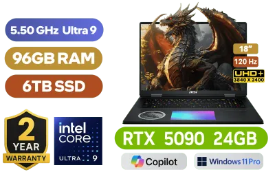 MSI Titan 18 HX A2XWJG Dragon Edition Norse Myth Intel® Core Ultra 9-285HX up to 5.50GHz Processor, 76MB Cache, 24x Cores, 24x Threads / 96GB DDR5 RAM / 6TB (3x 2TB) Ultra-Fast NVMe SSD / 18" UHD+ (3840x2400) Anti-Glare 120Hz Refresh-rate With IPS-Level Display / NVIDIA 50 Series GeForce RTX 5090 24GB GDDR7 Graphics With Desktop Level Performance / <span style="font-size: 20px; color: #00BFFF; font-weight: bold;">Windows 11 Professional (64bit)</span> / Killer Wi-Fi 7 B1750x Wireless LAN / Bluetooth v5.4 / IR FHD type (30fps@1080p) with HDR Web Camera / 3 x Type-A USB 3.2 / 2 x USB Type-C Thunderbolt 5 (DisplayPort / Power Delivery 3.1) / 1 x HDMI (8K @ 60Hz / 4K @ 120Hz) / 1 x Headphone and Microphone Combo Jack / 1 x RJ-45 Ethernet Lan / 1x SD Card Reader / 4x 2W Speaker; 2x 2W Woofer / Steelseries Cherry Mechanical Per Key RGB Backlit Gaming Keyboard With Copilot Key / Advance Cooler Boosts 5 Cooling System / FREE MSI Gaming Mouse / FREE MSI Gaming Mouse Pad / 2 Year MSI Warranty / MSI Titan 18 HX A2XWJG Dragon Edition Ultra 9 RTX 5090 Gaming LaptopMSI Titan 18 HX A2XWJG Dragon Edition Norse Myth Intel® Core Ultra 9-285HX up to 5.50GHz Processor, 76MB Cache, 24x Cores, 24x Threads / 96GB DDR5 RAM / 6TB (3x 2TB) Ultra-Fast NVMe SSD / 18" UHD+ (3840x2400) Anti-Glare 120Hz Refresh-rate With IPS-Level Display / NVIDIA 50 Series GeForce RTX 5090 24GB GDDR7 Graphics With Desktop Level Performance / Windows 11 Professional (64bit) / Killer Wi-Fi 7 B1750x Wireless LAN / Bluetooth v5.4 / IR FHD type (30fps@1080p) with HDR Web Camera / 3 x Type-A USB 3.2 / 2 x USB Type-C Thunderbolt 5 (DisplayPort / Power Delivery 3.1) / 1 x HDMI (8K @ 60Hz / 4K @ 120Hz) / 1 x Headphone and Microphone Combo Jack / 1 x RJ-45 Ethernet Lan / 1x SD Card Reader / 4x 2W Speaker; 2x 2W Woofer / Steelseries Cherry Mechanical Per Key RGB Backlit Gaming Keyboard With Copilot Key / Advance Cooler Boosts 5 Cooling System / FREE MSI Gaming Mouse / FREE MSI Gaming Mouse Pad / 2 Year MSI Warranty / MSI Titan 18 HX A2XWJG Dragon Edition Ultra 9 RTX 5090 Gaming Laptop [TITAN-18-HX-A2XWJG-659ZA] / [+]Get Resident Evil Requiem with select GeForce RTX 50 Series (Standard Edition)+ FREE DELIVERY !