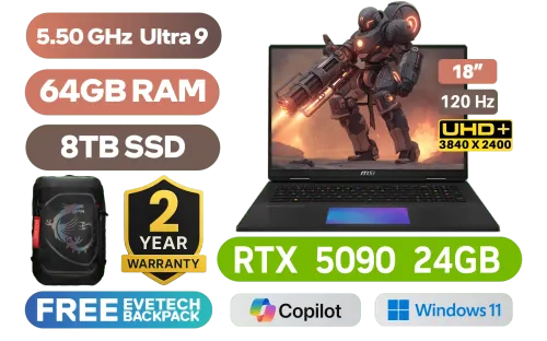 MSI Titan 18 HX AI A2XWJG Intel® Core Ultra 9-285HX up to 5.50GHz Processor, 76MB Cache, 24x Cores, 24x Threads / 64GB DDR5 RAM / 8TB Ultra-Fast NVMe SSD / 18" UHD+ (3840x2400) Anti-Glare 120Hz Refresh-rate With IPS-Level Display / NVIDIA 50 Series GeForce RTX 5090 24GB GDDR7 Graphics With Desktop Level Performance / Windows 11 Home (64bit) / Killer Wi-Fi 7 B1750x Wireless LAN / Bluetooth v5.4 / IR FHD type (30fps@1080p) with HDR Web Camera / 3 x Type-A USB 3.2 / 2 x USB Type-C Thunderbolt 5 (DisplayPort / Power Delivery 3.1) / 1 x HDMI (8K @ 60Hz / 4K @ 120Hz) / 1 x Headphone and Microphone Combo Jack / 1 x RJ-45 Ethernet Lan / 1x SD Card Reader / 4x 2W Speaker; 2x 2W Woofer / Steelseries Cherry Mechanical Per Key RGB Backlit Gaming Keyboard With Copilot Key / Advance Cooler Boosts 5 Cooling System / FREE MSI Gaming Mouse / FREE MSI Titan Gaming Backpack / 2 Year MSI Warranty / MSI Titan 18 HX AI A2XWJG Intel Core Ultra 9 RTX 5090 Gaming LaptopMSI Titan 18 HX AI A2XWJG Intel® Core Ultra 9-285HX up to 5.50GHz Processor, 76MB Cache, 24x Cores, 24x Threads / 64GB DDR5 RAM / 8TB Ultra-Fast NVMe SSD / 18" UHD+ (3840x2400) Anti-Glare 120Hz Refresh-rate With IPS-Level Display / NVIDIA 50 Series GeForce RTX 5090 24GB GDDR7 Graphics With Desktop Level Performance / Windows 11 Home (64bit) / Killer Wi-Fi 7 B1750x Wireless LAN / Bluetooth v5.4 / IR FHD type (30fps@1080p) with HDR Web Camera / 3 x Type-A USB 3.2 / 2 x USB Type-C Thunderbolt 5 (DisplayPort / Power Delivery 3.1) / 1 x HDMI (8K @ 60Hz / 4K @ 120Hz) / 1 x Headphone and Microphone Combo Jack / 1 x RJ-45 Ethernet Lan / 1x SD Card Reader / 4x 2W Speaker; 2x 2W Woofer / Steelseries Cherry Mechanical Per Key RGB Backlit Gaming Keyboard With Copilot Key / Advance Cooler Boosts 5 Cooling System / FREE MSI Gaming Mouse / FREE MSI Titan Gaming Backpack / 2 Year MSI Warranty / MSI Titan 18 HX AI A2XWJG Intel Core Ultra 9 RTX 5090 Gaming Laptop [TITAN-18-HX-AI-A2XWJG-263ZA/8TB] + FREE DELIVERY !