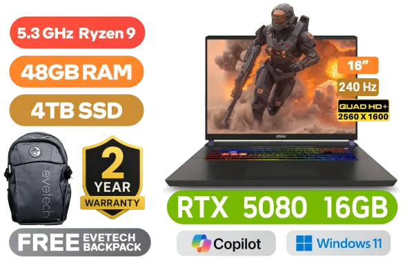 MSI Vector 16 HX AI A8WIG AMD Ryzen 9-8940HX up to 5.3GHz Processor, 80MB Cache, 16x Cores, 32x Threads / 48GB DDR5 RAM / 4TB Ultra-Fast NVMe SSD / 16" QHD+ (2560x1600) 240Hz IPS-Level Display / NVIDIA 50 Series GeForce RTX 5080 16GB GDDR7 Graphics / Windows 11 Home / RZ616 Wi-Fi 6E Wireless LAN / Bluetooth 5.4 / 1080p FHD IR Camera with Privacy Shutter / 2 x USB Type-A / 2 x USB Type-C (Supports Thunderbolt 4 / DisplayPort / Power Delivery 3.1) / 1 x HDMI / 1 x Headphone and Microphone Combo Jack / 1 x SD Express Card Reader / 1x RJ-45 / RGB Backlit Keyboard / Virtual Surround Sound Powered by Nahimic / 2 Year MSI Warranty / MSI Vector 16 HX AI A8WIG Ryzen 9 RTX 5080 Laptop DealsMSI Vector 16 HX AI A8WIG AMD Ryzen 9-8940HX up to 5.3GHz Processor, 80MB Cache, 16x Cores, 32x Threads / 48GB DDR5 RAM / 4TB Ultra-Fast NVMe SSD / 16" QHD+ (2560x1600) 240Hz IPS-Level Display / NVIDIA 50 Series GeForce RTX 5080 16GB GDDR7 Graphics / Windows 11 Home / RZ616 Wi-Fi 6E Wireless LAN / Bluetooth 5.4 / 1080p FHD IR Camera with Privacy Shutter / 2 x USB Type-A / 2 x USB Type-C (Supports Thunderbolt 4 / DisplayPort / Power Delivery 3.1) / 1 x HDMI / 1 x Headphone and Microphone Combo Jack / 1 x SD Express Card Reader / 1x RJ-45 / RGB Backlit Keyboard / Virtual Surround Sound Powered by Nahimic / 2 Year MSI Warranty / MSI Vector 16 HX AI A8WIG Ryzen 9 RTX 5080 Laptop Deals [Vector A16 HX A8WIG-071ZA/48GB/4TB] / [+] GET FREE EVETECH FLUX Premium Gaming Backpack+ FREE DELIVERY !