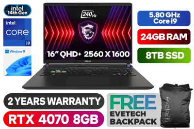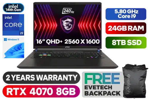 MSI VECTOR 16 HX A14VGG 14th Intel® Core™ i9-14900HX up to 5.80GHz Processor, 36MB Cache, 24x Cores, 32x Threads / 24GB DDR5 RAM / 8TB Ultra-Fast NVMe SSD / 16" QHD+ (2560 x 1600) Anti-Glare 240Hz IPS-Level Display / NVIDIA 40 Series GeForce RTX 4070 8GB GDDR6 Graphics With Desktop Level Performance / Windows 11 Home / Bluetooth 5.4 / Intel® Killer™ BE Wi-Fi 7 Wireless LAN / 1x RJ-45 / HD type (30fps@720p) Web Camera / Steelseries Per Key RGB Backlit Gaming Keyboard / 2 x Type-A USB 3.2 Gen1 / 3 x Type-C USB 3.2 Gen2 / 1 x HDMI / 1 x Headphone and Microphone Combo Jack / 1 x SD Card Reader / Virtual Surround Sound Powered by Nahimic / 2x 2W Speaker / 2 Year MSI Warranty / MSI VECTOR 16 HX A14VGG 14th Gen Core i9 RTX 4070 Gaming LaptopMSI VECTOR 16 HX A14VGG 14th Intel® Core™ i9-14900HX up to 5.80GHz Processor, 36MB Cache, 24x Cores, 32x Threads / 24GB DDR5 RAM / 8TB Ultra-Fast NVMe SSD / 16" QHD+ (2560 x 1600) Anti-Glare 240Hz IPS-Level Display / NVIDIA 40 Series GeForce RTX 4070 8GB GDDR6 Graphics With Desktop Level Performance / Windows 11 Home / Bluetooth 5.4 / Intel® Killer™ BE Wi-Fi 7 Wireless LAN / 1x RJ-45 / HD type (30fps@720p) Web Camera / Steelseries Per Key RGB Backlit Gaming Keyboard / 2 x Type-A USB 3.2 Gen1 / 3 x Type-C USB 3.2 Gen2 / 1 x HDMI / 1 x Headphone and Microphone Combo Jack / 1 x SD Card Reader / Virtual Surround Sound Powered by Nahimic / 2x 2W Speaker / 2 Year MSI Warranty / MSI VECTOR 16 HX A14VGG 14th Gen Core i9 RTX 4070 Gaming Laptop [VECTOR-16-HX-A14VGG-427ZA/24GB/8TB] + FREE DELIVERY !
