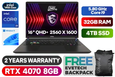 MSI VECTOR 16 HX A14VGG 14th Intel® Core™ i9-14900HX up to 5.80GHz Processor, 36MB Cache, 24x Cores, 32x Threads / 32GB DDR5 RAM / 4TB Ultra-Fast NVMe SSD / 16" QHD+ (2560 x 1600) Anti-Glare 240Hz IPS-Level Display / NVIDIA 40 Series GeForce RTX 4070 8GB GDDR6 Graphics With Desktop Level Performance / Windows 11 Home / Bluetooth 5.4 / Intel® Killer™ BE Wi-Fi 7 Wireless LAN / 1x RJ-45 / HD type (30fps@720p) Web Camera / Steelseries Per Key RGB Backlit Gaming Keyboard / 2 x Type-A USB 3.2 Gen1 / 3 x Type-C USB 3.2 Gen2 / 1 x HDMI / 1 x Headphone and Microphone Combo Jack / 1 x SD Card Reader / Virtual Surround Sound Powered by Nahimic / 2x 2W Speaker / 2 Year MSI Warranty / MSI VECTOR 16 HX A14VGG 14th Gen Core i9 RTX 4070 Gaming LaptopMSI VECTOR 16 HX A14VGG 14th Intel® Core™ i9-14900HX up to 5.80GHz Processor, 36MB Cache, 24x Cores, 32x Threads / 32GB DDR5 RAM / 4TB Ultra-Fast NVMe SSD / 16" QHD+ (2560 x 1600) Anti-Glare 240Hz IPS-Level Display / NVIDIA 40 Series GeForce RTX 4070 8GB GDDR6 Graphics With Desktop Level Performance / Windows 11 Home / Bluetooth 5.4 / Intel® Killer™ BE Wi-Fi 7 Wireless LAN / 1x RJ-45 / HD type (30fps@720p) Web Camera / Steelseries Per Key RGB Backlit Gaming Keyboard / 2 x Type-A USB 3.2 Gen1 / 3 x Type-C USB 3.2 Gen2 / 1 x HDMI / 1 x Headphone and Microphone Combo Jack / 1 x SD Card Reader / Virtual Surround Sound Powered by Nahimic / 2x 2W Speaker / 2 Year MSI Warranty / MSI VECTOR 16 HX A14VGG 14th Gen Core i9 RTX 4070 Gaming Laptop [VECTOR-16-HX-A14VGG-427ZA/32GB/4TB] + FREE DELIVERY !