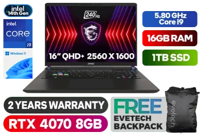 MSI VECTOR 16 HX A14VGG 14th Intel® Core™ i9-14900HX up to 5.80GHz Processor, 36MB Cache, 24x Cores, 32x Threads / 16GB DDR5 RAM / 1TB Ultra-Fast NVMe SSD / 16" QHD+ (2560 x 1600) Anti-Glare 240Hz IPS-Level Display / NVIDIA 40 Series GeForce RTX 4070 8GB GDDR6 Graphics With Desktop Level Performance / Windows 11 Home / Bluetooth 5.4 / Intel® Killer™ BE Wi-Fi 7 Wireless LAN / 1x RJ-45 / HD type (30fps@720p) Web Camera / Steelseries Per Key RGB Backlit Gaming Keyboard / 2 x Type-A USB 3.2 Gen1 / 3 x Type-C USB 3.2 Gen2 / 1 x HDMI / 1 x Headphone and Microphone Combo Jack / 1 x SD Card Reader / Virtual Surround Sound Powered by Nahimic / 2x 2W Speaker / 2 Year MSI Warranty / MSI VECTOR 16 HX A14VGG 14th Gen Core i9 RTX 4070 Gaming LaptopMSI VECTOR 16 HX A14VGG 14th Intel® Core™ i9-14900HX up to 5.80GHz Processor, 36MB Cache, 24x Cores, 32x Threads / 16GB DDR5 RAM / 1TB Ultra-Fast NVMe SSD / 16" QHD+ (2560 x 1600) Anti-Glare 240Hz IPS-Level Display / NVIDIA 40 Series GeForce RTX 4070 8GB GDDR6 Graphics With Desktop Level Performance / Windows 11 Home / Bluetooth 5.4 / Intel® Killer™ BE Wi-Fi 7 Wireless LAN / 1x RJ-45 / HD type (30fps@720p) Web Camera / Steelseries Per Key RGB Backlit Gaming Keyboard / 2 x Type-A USB 3.2 Gen1 / 3 x Type-C USB 3.2 Gen2 / 1 x HDMI / 1 x Headphone and Microphone Combo Jack / 1 x SD Card Reader / Virtual Surround Sound Powered by Nahimic / 2x 2W Speaker / 2 Year MSI Warranty / MSI VECTOR 16 HX A14VGG 14th Gen Core i9 RTX 4070 Gaming Laptop [VECTOR-16-HX-A14VGG-427ZA] + FREE DELIVERY !