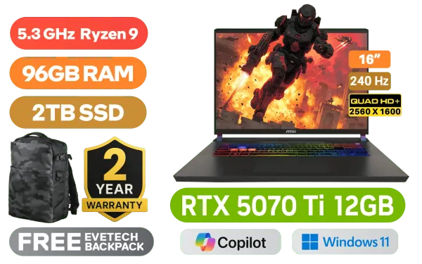 MSI Vector 16 HX AI A8WHG AMD Ryzen 9-8940HX up to 5.3GHz Processor, 80MB Cache, 16x Cores, 32x Threads / 96GB DDR5 RAM / 2TB Ultra-Fast NVMe SSD / 16" QHD+ (2560x1600) 240Hz IPS-Level Display / NVIDIA 50 Series GeForce RTX 5070 Ti 12GB GDDR7 Graphics / Windows 11 Home / MediaTek Wi-Fi 7 MT7925 Wireless LAN / Bluetooth 5.4 / 1080p FHD IR Camera with Privacy Shutter / 2 x USB Type-A / 2 x USB Type-C (Supports Thunderbolt 4 / DisplayPort / Power Delivery 3.1) / 1 x HDMI / 1 x Headphone and Microphone Combo Jack / 1 x SD Express Card Reader / 1x RJ-45 / RGB Backlit Keyboard / Virtual Surround Sound Powered by Nahimic / 2 Years Warranty / MSI Vector 16 HX AI A8WHG Ryzen 9 RTX 5070 Ti Laptop DealsMSI Vector 16 HX AI A8WHG AMD Ryzen 9-8940HX up to 5.3GHz Processor, 80MB Cache, 16x Cores, 32x Threads / 96GB DDR5 RAM / 2TB Ultra-Fast NVMe SSD / 16" QHD+ (2560x1600) 240Hz IPS-Level Display / NVIDIA 50 Series GeForce RTX 5070 Ti 12GB GDDR7 Graphics / Windows 11 Home / MediaTek Wi-Fi 7 MT7925 Wireless LAN / Bluetooth 5.4 / 1080p FHD IR Camera with Privacy Shutter / 2 x USB Type-A / 2 x USB Type-C (Supports Thunderbolt 4 / DisplayPort / Power Delivery 3.1) / 1 x HDMI / 1 x Headphone and Microphone Combo Jack / 1 x SD Express Card Reader / 1x RJ-45 / RGB Backlit Keyboard / Virtual Surround Sound Powered by Nahimic / 2 Years Warranty / MSI Vector 16 HX AI A8WHG Ryzen 9 RTX 5070 Ti Laptop Deals [Vector A16 HX A8WHG-070ZA/96GB/2TB] / [+] GET FREE EVETECH DASH Premium Gaming Backpack+ FREE DELIVERY !
