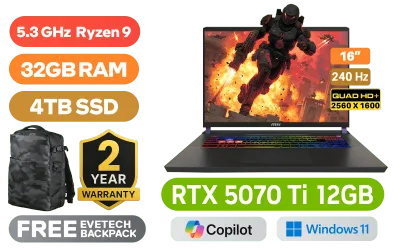MSI Vector 16 HX AI A8WHG AMD Ryzen 9-8940HX up to 5.3GHz Processor, 80MB Cache, 16x Cores, 32x Threads / 32GB DDR5 RAM / 4TB Ultra-Fast NVMe SSD / 16" QHD+ (2560x1600) 240Hz IPS-Level Display / NVIDIA 50 Series GeForce RTX 5070 Ti 12GB GDDR7 Graphics / Windows 11 Home / MediaTek Wi-Fi 7 MT7925 Wireless LAN / Bluetooth 5.4 / 1080p FHD IR Camera with Privacy Shutter / 2 x USB Type-A / 2 x USB Type-C (Supports Thunderbolt 4 / DisplayPort / Power Delivery 3.1) / 1 x HDMI / 1 x Headphone and Microphone Combo Jack / 1 x SD Express Card Reader / 1x RJ-45 / RGB Backlit Keyboard / Virtual Surround Sound Powered by Nahimic / 2 Years Warranty / MSI Vector 16 HX AI A8WHG Ryzen 9 RTX 5070 Ti Laptop DealsMSI Vector 16 HX AI A8WHG AMD Ryzen 9-8940HX up to 5.3GHz Processor, 80MB Cache, 16x Cores, 32x Threads / 32GB DDR5 RAM / 4TB Ultra-Fast NVMe SSD / 16" QHD+ (2560x1600) 240Hz IPS-Level Display / NVIDIA 50 Series GeForce RTX 5070 Ti 12GB GDDR7 Graphics / Windows 11 Home / MediaTek Wi-Fi 7 MT7925 Wireless LAN / Bluetooth 5.4 / 1080p FHD IR Camera with Privacy Shutter / 2 x USB Type-A / 2 x USB Type-C (Supports Thunderbolt 4 / DisplayPort / Power Delivery 3.1) / 1 x HDMI / 1 x Headphone and Microphone Combo Jack / 1 x SD Express Card Reader / 1x RJ-45 / RGB Backlit Keyboard / Virtual Surround Sound Powered by Nahimic / 2 Years Warranty / MSI Vector 16 HX AI A8WHG Ryzen 9 RTX 5070 Ti Laptop Deals [Vector A16 HX A8WHG-070ZA/4TB] / [+] GET FREE EVETECH DASH Premium Gaming Backpack+ FREE DELIVERY !