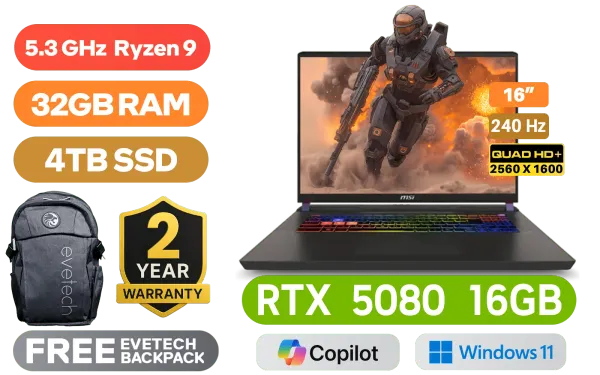 MSI Vector 16 HX AI A8WIG AMD Ryzen 9-8940HX up to 5.3GHz Processor, 80MB Cache, 16x Cores, 32x Threads / 32GB DDR5 RAM / 4TB Ultra-Fast NVMe SSD / 16" QHD+ (2560x1600) 240Hz IPS-Level Display / NVIDIA 50 Series GeForce RTX 5080 16GB GDDR7 Graphics / Windows 11 Home / RZ616 Wi-Fi 6E Wireless LAN / Bluetooth 5.4 / 1080p FHD IR Camera with Privacy Shutter / 2 x USB Type-A / 2 x USB Type-C (Supports Thunderbolt 4 / DisplayPort / Power Delivery 3.1) / 1 x HDMI / 1 x Headphone and Microphone Combo Jack / 1 x SD Express Card Reader / 1x RJ-45 / RGB Backlit Keyboard / Virtual Surround Sound Powered by Nahimic / 2 Year MSI Warranty / MSI Vector 16 HX AI A8WIG Ryzen 9 RTX 5080 Laptop DealsMSI Vector 16 HX AI A8WIG AMD Ryzen 9-8940HX up to 5.3GHz Processor, 80MB Cache, 16x Cores, 32x Threads / 32GB DDR5 RAM / 4TB Ultra-Fast NVMe SSD / 16" QHD+ (2560x1600) 240Hz IPS-Level Display / NVIDIA 50 Series GeForce RTX 5080 16GB GDDR7 Graphics / Windows 11 Home / RZ616 Wi-Fi 6E Wireless LAN / Bluetooth 5.4 / 1080p FHD IR Camera with Privacy Shutter / 2 x USB Type-A / 2 x USB Type-C (Supports Thunderbolt 4 / DisplayPort / Power Delivery 3.1) / 1 x HDMI / 1 x Headphone and Microphone Combo Jack / 1 x SD Express Card Reader / 1x RJ-45 / RGB Backlit Keyboard / Virtual Surround Sound Powered by Nahimic / 2 Year MSI Warranty / MSI Vector 16 HX AI A8WIG Ryzen 9 RTX 5080 Laptop Deals [Vector A16 HX A8WIG-071ZA/4TB] / [+] GET FREE EVETECH FLUX Premium Gaming Backpack+ FREE DELIVERY !