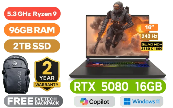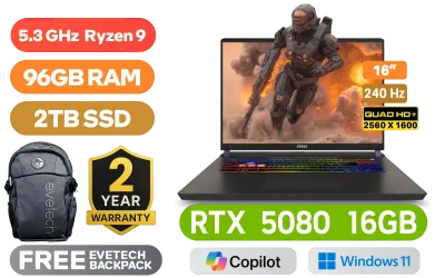 MSI Vector 16 HX AI A8WIG AMD Ryzen 9-8940HX up to 5.3GHz Processor, 80MB Cache, 16x Cores, 32x Threads / 96GB DDR5 RAM / 2TB Ultra-Fast NVMe SSD / 16" QHD+ (2560x1600) 240Hz IPS-Level Display / NVIDIA 50 Series GeForce RTX 5080 16GB GDDR7 Graphics / Windows 11 Home / RZ616 Wi-Fi 6E Wireless LAN / Bluetooth 5.4 / 1080p FHD IR Camera with Privacy Shutter / 2 x USB Type-A / 2 x USB Type-C (Supports Thunderbolt 4 / DisplayPort / Power Delivery 3.1) / 1 x HDMI / 1 x Headphone and Microphone Combo Jack / 1 x SD Express Card Reader / 1x RJ-45 / RGB Backlit Keyboard / Virtual Surround Sound Powered by Nahimic / 2 Year MSI Warranty / MSI Vector 16 HX AI A8WIG Ryzen 9 RTX 5080 Laptop DealsMSI Vector 16 HX AI A8WIG AMD Ryzen 9-8940HX up to 5.3GHz Processor, 80MB Cache, 16x Cores, 32x Threads / 96GB DDR5 RAM / 2TB Ultra-Fast NVMe SSD / 16" QHD+ (2560x1600) 240Hz IPS-Level Display / NVIDIA 50 Series GeForce RTX 5080 16GB GDDR7 Graphics / Windows 11 Home / RZ616 Wi-Fi 6E Wireless LAN / Bluetooth 5.4 / 1080p FHD IR Camera with Privacy Shutter / 2 x USB Type-A / 2 x USB Type-C (Supports Thunderbolt 4 / DisplayPort / Power Delivery 3.1) / 1 x HDMI / 1 x Headphone and Microphone Combo Jack / 1 x SD Express Card Reader / 1x RJ-45 / RGB Backlit Keyboard / Virtual Surround Sound Powered by Nahimic / 2 Year MSI Warranty / MSI Vector 16 HX AI A8WIG Ryzen 9 RTX 5080 Laptop Deals [Vector A16 HX A8WIG-071ZA/96GB/2TB] / [+] GET FREE EVETECH FLUX Premium Gaming Backpack+ FREE DELIVERY !