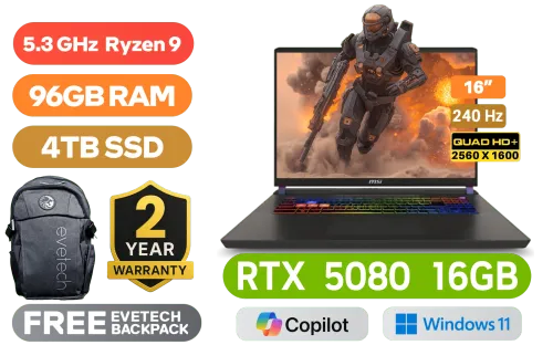 MSI Vector 16 HX AI A8WIG AMD Ryzen 9-8940HX up to 5.3GHz Processor, 80MB Cache, 16x Cores, 32x Threads / 96GB DDR5 RAM / 4TB Ultra-Fast NVMe SSD / 16" QHD+ (2560x1600) 240Hz IPS-Level Display / NVIDIA 50 Series GeForce RTX 5080 16GB GDDR7 Graphics / Windows 11 Home / RZ616 Wi-Fi 6E Wireless LAN / Bluetooth 5.4 / 1080p FHD IR Camera with Privacy Shutter / 2 x USB Type-A / 2 x USB Type-C (Supports Thunderbolt 4 / DisplayPort / Power Delivery 3.1) / 1 x HDMI / 1 x Headphone and Microphone Combo Jack / 1 x SD Express Card Reader / 1x RJ-45 / RGB Backlit Keyboard / Virtual Surround Sound Powered by Nahimic / 2 Year MSI Warranty / MSI Vector 16 HX AI A8WIG Ryzen 9 RTX 5080 Laptop DealsMSI Vector 16 HX AI A8WIG AMD Ryzen 9-8940HX up to 5.3GHz Processor, 80MB Cache, 16x Cores, 32x Threads / 96GB DDR5 RAM / 4TB Ultra-Fast NVMe SSD / 16" QHD+ (2560x1600) 240Hz IPS-Level Display / NVIDIA 50 Series GeForce RTX 5080 16GB GDDR7 Graphics / Windows 11 Home / RZ616 Wi-Fi 6E Wireless LAN / Bluetooth 5.4 / 1080p FHD IR Camera with Privacy Shutter / 2 x USB Type-A / 2 x USB Type-C (Supports Thunderbolt 4 / DisplayPort / Power Delivery 3.1) / 1 x HDMI / 1 x Headphone and Microphone Combo Jack / 1 x SD Express Card Reader / 1x RJ-45 / RGB Backlit Keyboard / Virtual Surround Sound Powered by Nahimic / 2 Year MSI Warranty / MSI Vector 16 HX AI A8WIG Ryzen 9 RTX 5080 Laptop Deals [Vector A16 HX A8WIG-071ZA/96GB/4TB] / [+] GET FREE EVETECH FLUX Premium Gaming Backpack / [+] Get PRAGMATA with select GeForce RTX 50 Series + FREE DELIVERY !