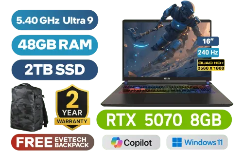 MSI VECTOR 16 HX AI A2XWGG Intel® Core™ Ultra 9-275HX up to 5.40GHz Processor, 76MB Cache, 24x Cores, 24x Threads / 48GB DDR5 RAM / 2TB Ultra-Fast NVMe SSD / 16" QHD+ (2560 x 1600) Anti-Glare 240Hz IPS-Level Display / NVIDIA 50 Series GeForce RTX 5070 8GB GDDR7 Graphics With Desktop Level Performance / Windows 11 Home / Intel® Killer™ BE Wi-Fi 7 BR1750x Wireless LAN / Bluetooth 5.4 / IR FHD type (30fps@1080p) with HDR Web Camera / 2 x USB Type-A 3.2 Gen2 / 2 x USB Type-C Thunderbolt 5 (DisplayPort / Power Delivery 3.1) / 1 x HDMI (8K@ 60Hz / 4K@ 120Hz) / 1 x Headphone and Microphone Combo Jack / 1 x SD Card Reader / 1x RJ-45 Ethernet Lan / 24-Zone RGB Backlit Gaming Keyboard With Copilot Key / Virtual Surround Sound Powered by Nahimic / 2x 2W Speaker / 2 Year MSI Warranty / MSI VECTOR 16 HX AI A2XWGG Core Ultra 9 RTX 5070 Gaming LaptopMSI VECTOR 16 HX AI A2XWGG Intel® Core™ Ultra 9-275HX up to 5.40GHz Processor, 76MB Cache, 24x Cores, 24x Threads / 48GB DDR5 RAM / 2TB Ultra-Fast NVMe SSD / 16" QHD+ (2560 x 1600) Anti-Glare 240Hz IPS-Level Display / NVIDIA 50 Series GeForce RTX 5070 8GB GDDR7 Graphics With Desktop Level Performance / Windows 11 Home / Intel® Killer™ BE Wi-Fi 7 BR1750x Wireless LAN / Bluetooth 5.4 / IR FHD type (30fps@1080p) with HDR Web Camera / 2 x USB Type-A 3.2 Gen2 / 2 x USB Type-C Thunderbolt 5 (DisplayPort / Power Delivery 3.1) / 1 x HDMI (8K@ 60Hz / 4K@ 120Hz) / 1 x Headphone and Microphone Combo Jack / 1 x SD Card Reader / 1x RJ-45 Ethernet Lan / 24-Zone RGB Backlit Gaming Keyboard With Copilot Key / Virtual Surround Sound Powered by Nahimic / 2x 2W Speaker / 2 Year MSI Warranty / MSI VECTOR 16 HX AI A2XWGG Core Ultra 9 RTX 5070 Gaming Laptop [VECTOR-16-HX-AI-A2XWGG-010ZA/48GB/2TB] / [+] GET FREE EVETECH DASH Premium Gaming Backpack / [+]Get Resident Evil: Requiem with select GeForce RTX 50 Series (Standard Edition)+ FREE DELIVERY !