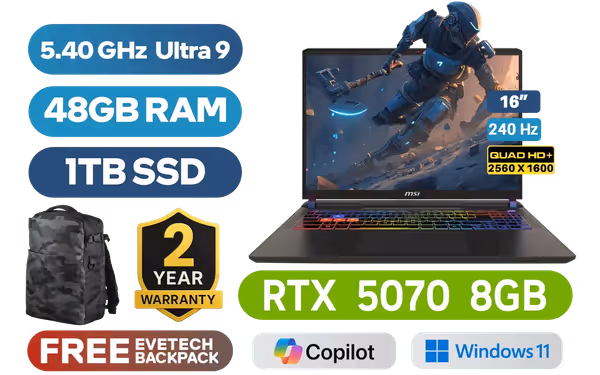 MSI VECTOR 16 HX AI A2XWGG Intel® Core™ Ultra 9-275HX up to 5.40GHz Processor, 76MB Cache, 24x Cores, 24x Threads / 48GB DDR5 RAM / 1TB Ultra-Fast NVMe SSD / 16" QHD+ (2560 x 1600) Anti-Glare 240Hz IPS-Level Display / NVIDIA 50 Series GeForce RTX 5070 8GB GDDR7 Graphics With Desktop Level Performance / Windows 11 Home / Intel® Killer™ BE Wi-Fi 7 BR1750x Wireless LAN / Bluetooth 5.4 / IR FHD type (30fps@1080p) with HDR Web Camera / 2 x USB Type-A 3.2 Gen2 / 2 x USB Type-C Thunderbolt 5 (DisplayPort / Power Delivery 3.1) / 1 x HDMI (8K@ 60Hz / 4K@ 120Hz) / 1 x Headphone and Microphone Combo Jack / 1 x SD Card Reader / 1x RJ-45 Ethernet Lan / 24-Zone RGB Backlit Gaming Keyboard With Copilot Key / Virtual Surround Sound Powered by Nahimic / 2x 2W Speaker / 2 Year MSI Warranty / MSI VECTOR 16 HX AI A2XWGG Core Ultra 9 RTX 5070 Gaming LaptopMSI VECTOR 16 HX AI A2XWGG Intel® Core™ Ultra 9-275HX up to 5.40GHz Processor, 76MB Cache, 24x Cores, 24x Threads / 48GB DDR5 RAM / 1TB Ultra-Fast NVMe SSD / 16" QHD+ (2560 x 1600) Anti-Glare 240Hz IPS-Level Display / NVIDIA 50 Series GeForce RTX 5070 8GB GDDR7 Graphics With Desktop Level Performance / Windows 11 Home / Intel® Killer™ BE Wi-Fi 7 BR1750x Wireless LAN / Bluetooth 5.4 / IR FHD type (30fps@1080p) with HDR Web Camera / 2 x USB Type-A 3.2 Gen2 / 2 x USB Type-C Thunderbolt 5 (DisplayPort / Power Delivery 3.1) / 1 x HDMI (8K@ 60Hz / 4K@ 120Hz) / 1 x Headphone and Microphone Combo Jack / 1 x SD Card Reader / 1x RJ-45 Ethernet Lan / 24-Zone RGB Backlit Gaming Keyboard With Copilot Key / Virtual Surround Sound Powered by Nahimic / 2x 2W Speaker / 2 Year MSI Warranty / MSI VECTOR 16 HX AI A2XWGG Core Ultra 9 RTX 5070 Gaming Laptop [VECTOR-16-HX-AI-A2XWGG-010ZA/48GB] / [+] GET FREE EVETECH DASH Premium Gaming Backpack / [+] Get PRAGMATA with select GeForce RTX 50 Series + FREE DELIVERY !