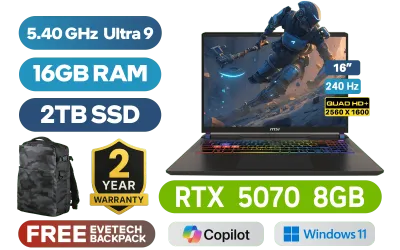 MSI VECTOR 16 HX AI A2XWGG Intel® Core™ Ultra 9-275HX up to 5.40GHz Processor, 76MB Cache, 24x Cores, 24x Threads / 16GB DDR5 RAM / 2TB Ultra-Fast NVMe SSD / 16" QHD+ (2560 x 1600) Anti-Glare 240Hz IPS-Level Display / NVIDIA 50 Series GeForce RTX 5070 8GB GDDR7 Graphics With Desktop Level Performance / Windows 11 Home / Intel® Killer™ BE Wi-Fi 7 BR1750x Wireless LAN / Bluetooth 5.4 / IR FHD type (30fps@1080p) with HDR Web Camera / 2 x USB Type-A 3.2 Gen2 / 2 x USB Type-C Thunderbolt 5 (DisplayPort / Power Delivery 3.1) / 1 x HDMI (8K@ 60Hz / 4K@ 120Hz) / 1 x Headphone and Microphone Combo Jack / 1 x SD Card Reader / 1x RJ-45 Ethernet Lan / 24-Zone RGB Backlit Gaming Keyboard With Copilot Key / Virtual Surround Sound Powered by Nahimic / 2x 2W Speaker / 2 Year MSI Warranty / MSI VECTOR 16 HX AI A2XWGG Core Ultra 9 RTX 5070 Gaming LaptopMSI VECTOR 16 HX AI A2XWGG Intel® Core™ Ultra 9-275HX up to 5.40GHz Processor, 76MB Cache, 24x Cores, 24x Threads / 16GB DDR5 RAM / 2TB Ultra-Fast NVMe SSD / 16" QHD+ (2560 x 1600) Anti-Glare 240Hz IPS-Level Display / NVIDIA 50 Series GeForce RTX 5070 8GB GDDR7 Graphics With Desktop Level Performance / Windows 11 Home / Intel® Killer™ BE Wi-Fi 7 BR1750x Wireless LAN / Bluetooth 5.4 / IR FHD type (30fps@1080p) with HDR Web Camera / 2 x USB Type-A 3.2 Gen2 / 2 x USB Type-C Thunderbolt 5 (DisplayPort / Power Delivery 3.1) / 1 x HDMI (8K@ 60Hz / 4K@ 120Hz) / 1 x Headphone and Microphone Combo Jack / 1 x SD Card Reader / 1x RJ-45 Ethernet Lan / 24-Zone RGB Backlit Gaming Keyboard With Copilot Key / Virtual Surround Sound Powered by Nahimic / 2x 2W Speaker / 2 Year MSI Warranty / MSI VECTOR 16 HX AI A2XWGG Core Ultra 9 RTX 5070 Gaming Laptop [VECTOR-16-HX-AI-A2XWGG-010ZA/2TB] / [+] GET FREE EVETECH DASH Premium Gaming Backpack / [+]Get Resident Evil Requiem with select GeForce RTX 50 Series (Standard Edition)+ FREE DELIVERY !