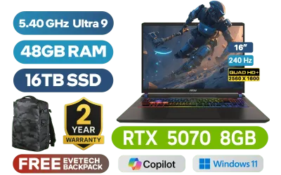 MSI VECTOR 16 HX AI A2XWGG Intel® Core™ Ultra 9-275HX up to 5.40GHz Processor, 76MB Cache, 24x Cores, 24x Threads / 48GB DDR5 RAM / 16TB Ultra-Fast NVMe SSD / 16" QHD+ (2560 x 1600) Anti-Glare 240Hz IPS-Level Display / NVIDIA 50 Series GeForce RTX 5070 8GB GDDR7 Graphics With Desktop Level Performance / Windows 11 Home / Intel® Killer™ BE Wi-Fi 7 BR1750x Wireless LAN / Bluetooth 5.4 / IR FHD type (30fps@1080p) with HDR Web Camera / 2 x USB Type-A 3.2 Gen2 / 2 x USB Type-C Thunderbolt 5 (DisplayPort / Power Delivery 3.1) / 1 x HDMI (8K@ 60Hz / 4K@ 120Hz) / 1 x Headphone and Microphone Combo Jack / 1 x SD Card Reader / 1x RJ-45 Ethernet Lan / 24-Zone RGB Backlit Gaming Keyboard With Copilot Key / Virtual Surround Sound Powered by Nahimic / 2x 2W Speaker / 2 Year MSI Warranty / MSI VECTOR 16 HX AI A2XWGG Core Ultra 9 RTX 5070 Gaming LaptopMSI VECTOR 16 HX AI A2XWGG Intel® Core™ Ultra 9-275HX up to 5.40GHz Processor, 76MB Cache, 24x Cores, 24x Threads / 48GB DDR5 RAM / 16TB Ultra-Fast NVMe SSD / 16" QHD+ (2560 x 1600) Anti-Glare 240Hz IPS-Level Display / NVIDIA 50 Series GeForce RTX 5070 8GB GDDR7 Graphics With Desktop Level Performance / Windows 11 Home / Intel® Killer™ BE Wi-Fi 7 BR1750x Wireless LAN / Bluetooth 5.4 / IR FHD type (30fps@1080p) with HDR Web Camera / 2 x USB Type-A 3.2 Gen2 / 2 x USB Type-C Thunderbolt 5 (DisplayPort / Power Delivery 3.1) / 1 x HDMI (8K@ 60Hz / 4K@ 120Hz) / 1 x Headphone and Microphone Combo Jack / 1 x SD Card Reader / 1x RJ-45 Ethernet Lan / 24-Zone RGB Backlit Gaming Keyboard With Copilot Key / Virtual Surround Sound Powered by Nahimic / 2x 2W Speaker / 2 Year MSI Warranty / MSI VECTOR 16 HX AI A2XWGG Core Ultra 9 RTX 5070 Gaming Laptop [VECTOR-16-HX-AI-A2XWGG-010ZA/48GB/16TB] / [+] GET FREE EVETECH DASH Premium Gaming Backpack / [+]Get Resident Evil Requiem with select GeForce RTX 50 Series (Standard Edition)+ FREE DELIVERY !