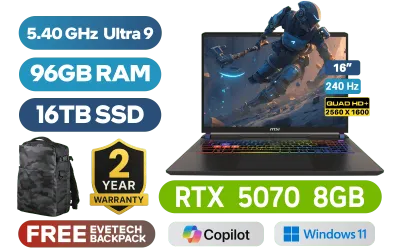 MSI VECTOR 16 HX AI A2XWGG Intel® Core™ Ultra 9-275HX up to 5.40GHz Processor, 76MB Cache, 24x Cores, 24x Threads / 96GB DDR5 RAM / 16TB Ultra-Fast NVMe SSD / 16" QHD+ (2560 x 1600) Anti-Glare 240Hz IPS-Level Display / NVIDIA 50 Series GeForce RTX 5070 8GB GDDR7 Graphics With Desktop Level Performance / Windows 11 Home / Intel® Killer™ BE Wi-Fi 7 BR1750x Wireless LAN / Bluetooth 5.4 / IR FHD type (30fps@1080p) with HDR Web Camera / 2 x USB Type-A 3.2 Gen2 / 2 x USB Type-C Thunderbolt 5 (DisplayPort / Power Delivery 3.1) / 1 x HDMI (8K@ 60Hz / 4K@ 120Hz) / 1 x Headphone and Microphone Combo Jack / 1 x SD Card Reader / 1x RJ-45 Ethernet Lan / 24-Zone RGB Backlit Gaming Keyboard With Copilot Key / Virtual Surround Sound Powered by Nahimic / 2x 2W Speaker / 2 Year MSI Warranty / MSI VECTOR 16 HX AI A2XWGG Core Ultra 9 RTX 5070 Gaming LaptopMSI VECTOR 16 HX AI A2XWGG Intel® Core™ Ultra 9-275HX up to 5.40GHz Processor, 76MB Cache, 24x Cores, 24x Threads / 96GB DDR5 RAM / 16TB Ultra-Fast NVMe SSD / 16" QHD+ (2560 x 1600) Anti-Glare 240Hz IPS-Level Display / NVIDIA 50 Series GeForce RTX 5070 8GB GDDR7 Graphics With Desktop Level Performance / Windows 11 Home / Intel® Killer™ BE Wi-Fi 7 BR1750x Wireless LAN / Bluetooth 5.4 / IR FHD type (30fps@1080p) with HDR Web Camera / 2 x USB Type-A 3.2 Gen2 / 2 x USB Type-C Thunderbolt 5 (DisplayPort / Power Delivery 3.1) / 1 x HDMI (8K@ 60Hz / 4K@ 120Hz) / 1 x Headphone and Microphone Combo Jack / 1 x SD Card Reader / 1x RJ-45 Ethernet Lan / 24-Zone RGB Backlit Gaming Keyboard With Copilot Key / Virtual Surround Sound Powered by Nahimic / 2x 2W Speaker / 2 Year MSI Warranty / MSI VECTOR 16 HX AI A2XWGG Core Ultra 9 RTX 5070 Gaming Laptop [VECTOR-16-HX-AI-A2XWGG-010ZA/96GB/16TB] / [+] GET FREE EVETECH DASH Premium Gaming Backpack / [+]Get Resident Evil Requiem with select GeForce RTX 50 Series (Standard Edition)+ FREE DELIVERY !