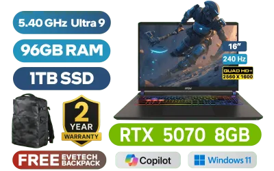 MSI VECTOR 16 HX AI A2XWGG Intel® Core™ Ultra 9-275HX up to 5.40GHz Processor, 76MB Cache, 24x Cores, 24x Threads / 96GB DDR5 RAM / 1TB Ultra-Fast NVMe SSD / 16" QHD+ (2560 x 1600) Anti-Glare 240Hz IPS-Level Display / NVIDIA 50 Series GeForce RTX 5070 8GB GDDR7 Graphics With Desktop Level Performance / Windows 11 Home / Intel® Killer™ BE Wi-Fi 7 BR1750x Wireless LAN / Bluetooth 5.4 / IR FHD type (30fps@1080p) with HDR Web Camera / 2 x USB Type-A 3.2 Gen2 / 2 x USB Type-C Thunderbolt 5 (DisplayPort / Power Delivery 3.1) / 1 x HDMI (8K@ 60Hz / 4K@ 120Hz) / 1 x Headphone and Microphone Combo Jack / 1 x SD Card Reader / 1x RJ-45 Ethernet Lan / 24-Zone RGB Backlit Gaming Keyboard With Copilot Key / Virtual Surround Sound Powered by Nahimic / 2x 2W Speaker / 2 Year MSI Warranty / MSI VECTOR 16 HX AI A2XWGG Core Ultra 9 RTX 5070 Gaming LaptopMSI VECTOR 16 HX AI A2XWGG Intel® Core™ Ultra 9-275HX up to 5.40GHz Processor, 76MB Cache, 24x Cores, 24x Threads / 96GB DDR5 RAM / 1TB Ultra-Fast NVMe SSD / 16" QHD+ (2560 x 1600) Anti-Glare 240Hz IPS-Level Display / NVIDIA 50 Series GeForce RTX 5070 8GB GDDR7 Graphics With Desktop Level Performance / Windows 11 Home / Intel® Killer™ BE Wi-Fi 7 BR1750x Wireless LAN / Bluetooth 5.4 / IR FHD type (30fps@1080p) with HDR Web Camera / 2 x USB Type-A 3.2 Gen2 / 2 x USB Type-C Thunderbolt 5 (DisplayPort / Power Delivery 3.1) / 1 x HDMI (8K@ 60Hz / 4K@ 120Hz) / 1 x Headphone and Microphone Combo Jack / 1 x SD Card Reader / 1x RJ-45 Ethernet Lan / 24-Zone RGB Backlit Gaming Keyboard With Copilot Key / Virtual Surround Sound Powered by Nahimic / 2x 2W Speaker / 2 Year MSI Warranty / MSI VECTOR 16 HX AI A2XWGG Core Ultra 9 RTX 5070 Gaming Laptop [VECTOR-16-HX-AI-A2XWGG-010ZA/96GB] / [+] GET FREE EVETECH DASH Premium Gaming Backpack / [+]Get Resident Evil Requiem with select GeForce RTX 50 Series (Standard Edition)+ FREE DELIVERY !